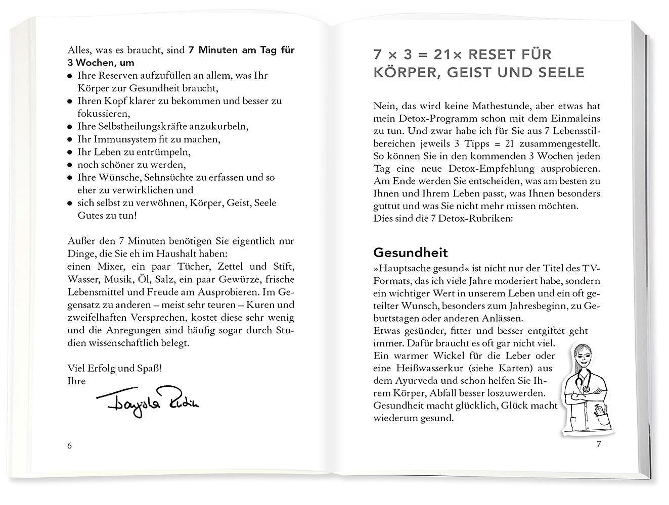Mit kleinen schnellen Tricks wie neu geboren? Sich endlich wieder gesünder fühlen? Die Bestsellerautorin Dr. med. Franziska Rubin bietet ein knackiges Runderneuerungs-Programm im Kartenformat an. Alles, was Sie für ihre Detox-Kur benötigen, sind 7 Minuten pro Tag und drei Wochen Durchhaltevermögen. Den Kopf frei machen, die Leber entgiften, die Arterien putzen, die Gedanken reinigen, Verspannungen lösen oder Niere und Darm entlasten - diese praktische Kartenbox ist ein echtes Wohlfühlangebot für Körper, Geist und Seele. Befreien Sie sich von unnötigem Ballast und füllen Sie Ihre Speicher auf - in nur 21 Tagen mit täglich 7 Minuten Ihres Lebens. Diese Gesundheits-Box ist eine kleine Wohlfühlkur mit gesunden Rezepte aus der Apotheke der Natur, sowie Tipps für eine ganzheitliche Ernährung und innere wie äußere Schönheit. Dr. med. Franziska Rubin verpackt ihr Wissen über alternative Heilmethoden kompakt, verständlich und abwechslungsreich in einem Detox-Ratgeber der besonderen Art. Diese Detox-Box ist das neue must-have für erfolgreiches und natürliches Entgiften des Körpers.