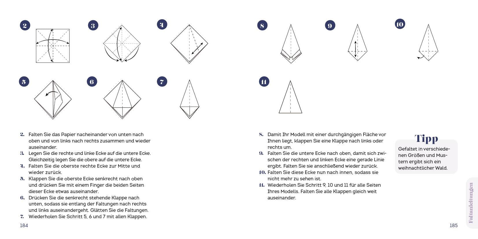 Anschauliche Grundlagen:Im Grundlagenteil finden sich illustrierte Faltanleitungen für Figuren wie Lilie, Schmetterling, Sakurablüte, Weihnachtsbaum oder Glockenblume