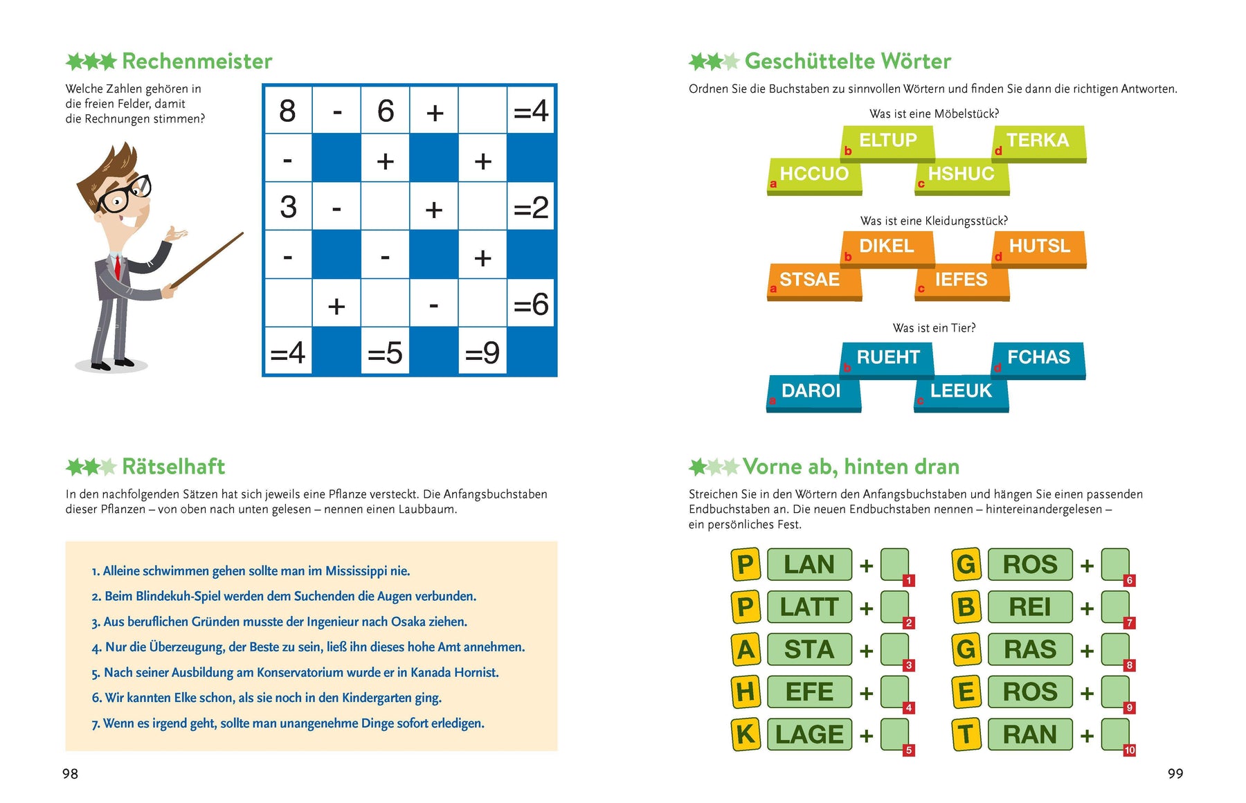 Freuen Sie sich auf 365 abwechslungsreiche Buchstaben- und Logikrätsel, Denkspiele und Gedächtnisübungen in drei Schwierigkeitsstufen. Sie aktivieren zielgerichtet Ihre grauen Zellen, verbessern unterhaltsam und effektiv Konzentration, Kombinationsgabe und Merkfähigkeit und sorgen außerdem für jede Menge Rätselspaß. So bleibt Ihr Gehirn jung und frisch!