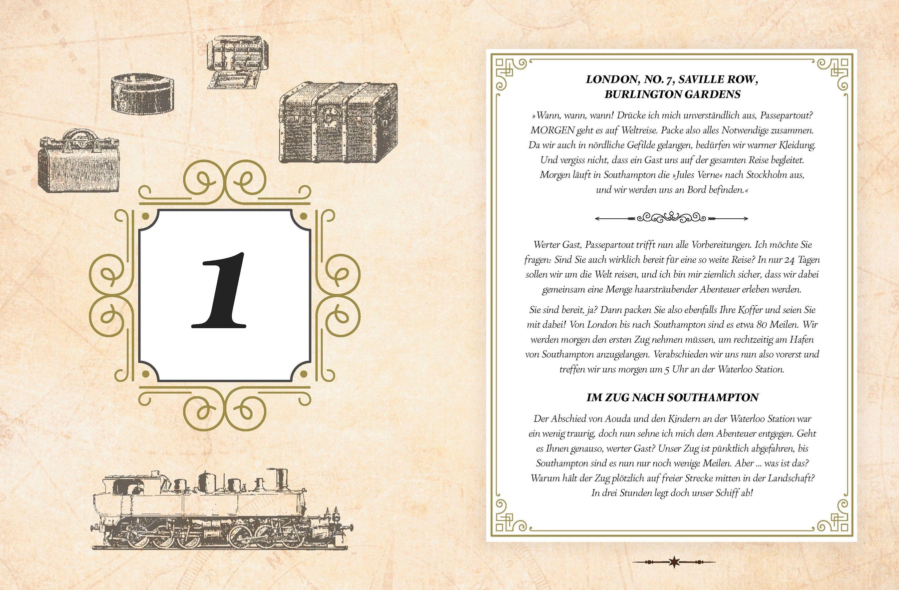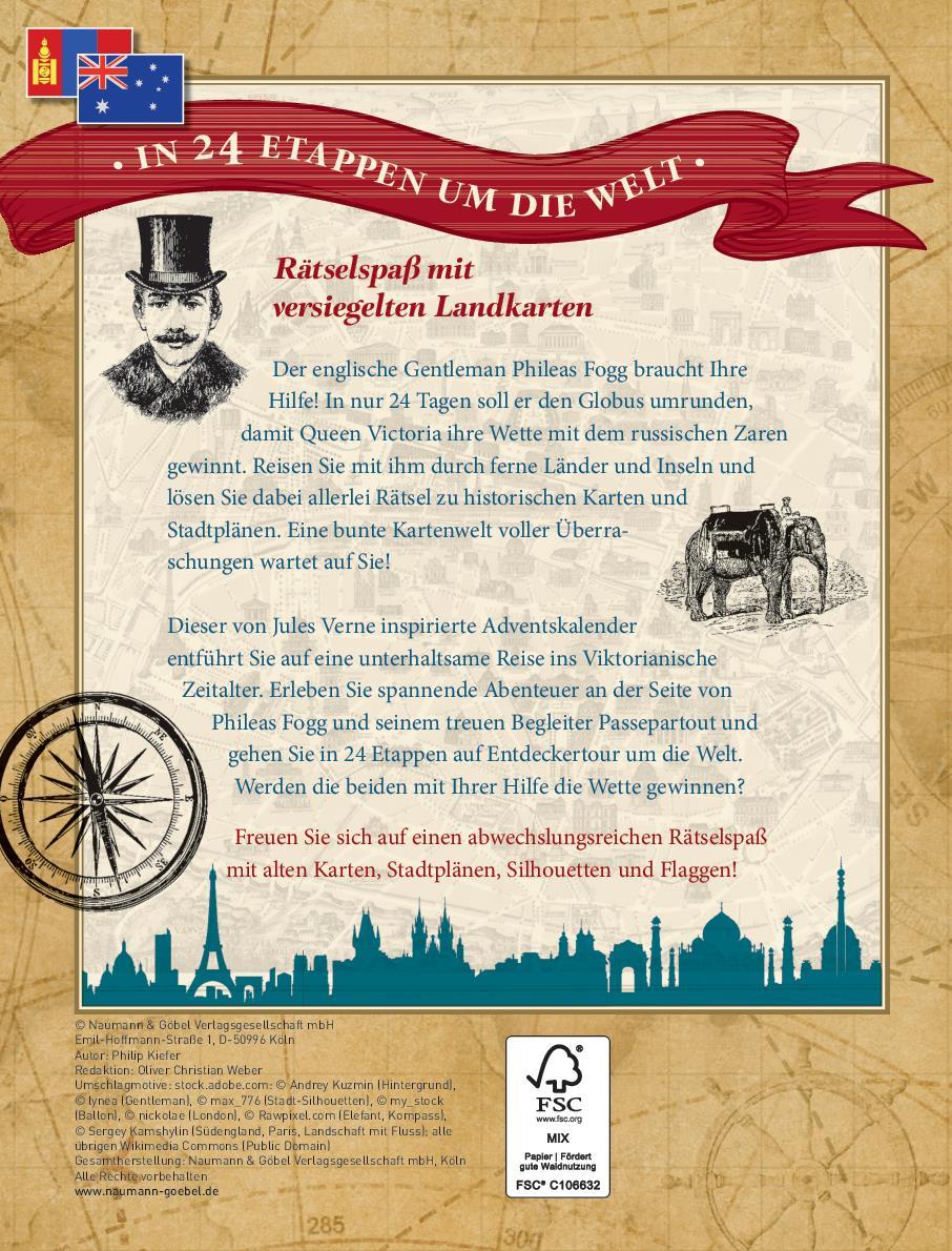Dieser von Jules Verne inspirierte Adventskalender entführt Sie auf eine unterhaltsame Reise ins Viktorianische Zeitalter. Erleben Sie spannende Abenteuer an der Seite von Phileas Fogg und seinem treuen Begleiter Passepartout und gehen Sie auf Entdeckertour in 24 Etappen um die Welt. Werden die beiden mit Ihrer Hilfe die Wette gewinnen?