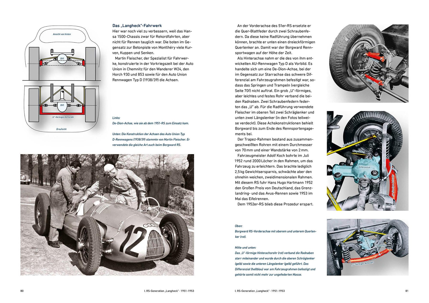 Die Isabella und der kleine Lloyd gehören zu den bekanntesten Autos der 50er- und 60er-Jahre. Der Bremer Automobilhersteller Borgward baute nicht nur elegante Limousinen und sparsame Kleinwagen, sondern auch Rennwagen. Seit 1950 beteiligte sich das Bremer Werk am internationalen Motorsport. Im August 1950 erregten Rekordfahrten auf der Bahn von Montlhéry bei Paris Aufsehen. Die Fahrt ging über 5000 Meilen und dauerte mehr als 48 Stunden. Der stromlinienförmige Borgward stellte dabei 12 Strecken- und Zeitrekorde auf. Die Höchstgeschwindigkeit betrug 196 km/h. 1952 fuhren die Bremer erste Siege gegen internationale Konkurrenz ein. Die Leistung lag damals bei 80 PS. Bis 1959 steigerte der Borgward Motorenkonstrukteur Karl-Ludwig Brandt sie auf annähernd 160 PS, was für eine Geschwindigkeit von 270 km/h ausreichte. 1953 fuhr Borgwards Werksfahrer Hans Hugo Hartmann das härteste Rennen der Welt mit. Die Carrera Panamericana zog sich über 3000 Kilometer durch Mexiko. Hartmann führte in der Sportwagenklasse bis 1,5-Liter-Hubraum. Doch 200 km vor dem Ziel brach eine Ventilfeder. Mit erheblich geringerer Motorleistung schleppte er sich zum Zielort. Sein Vorsprung von mehr als 1 ¿ Stunden gegenüber dem nächsten Konkurrenten sollte ihm den Sieg sichern. Aber er überschritt das vorgeschriebene Zeitlimit der letzten Etappe um 7 Sekunden. Disqualifikation! Alle großen Zeitungen der Welt berichteten über Pechvogel Hartmann. Der Presserummel war für die Borgward-Werke ein Segen. Der Bekanntheitsgrad stieg immens. Ab Mitte der 50er-Jahre entwickelten sich die Veranstaltungen immer stärker zu einem Konkurrenzkampf zwischen Porsche und Borgward. Das gipfelte 1958 im Avus-Rennen, als nach 40 Runden (332 km) und 1 Stunde 36 Minuten Porsche mit einem Vorsprung von 0,8 Sekunden (!) gewann. Der Sportwagenhersteller Porsche konnte es nicht zulassen, auf den zweiten Platz abgeschoben zu werden. Das wäre dem Image abträglich gewesen. Die Stuttgarter hätten jede Summe investiert, um es nicht so weit kommen zulassen. Da konnte Borgward nicht mithalten. Außerdem vermutete Carl F. W. Borgward, dass die Werbewirkung gewonnener Rennen wesentlich geringere Auswirkungen auf das Pkw-Geschäft besaß als angenommen. Er gab den Rennsport auf. Der zweite Teil des Buchs widmet sich der Technik. Ausführlich werden die fünf unterschiedlichen Motoren vorgestellt. Anhand von Fotos und Zeichnungen erklärt der Autor die Schwächen und Stärken der Achskonstruktionen und die Windschnittigkeit der im Windkanal getesteten Karosserien. Ein kleines Kapitel über den Verbleib der Borgward-RS-Wagen, Rennlisten und Tabellen der technischen Daten der Fahrzeuge sowie der Motoren schließen das Buch ab.