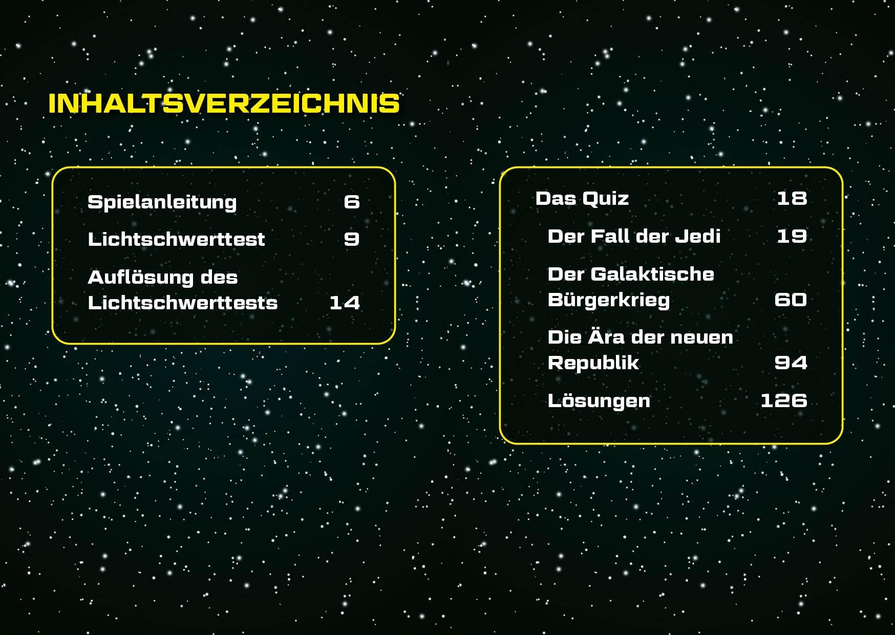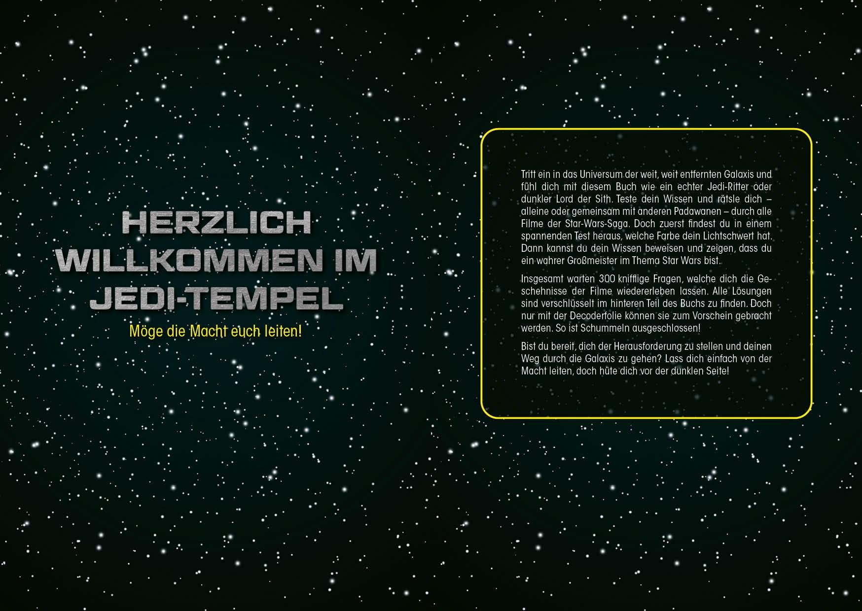 Finde mit dem Einstufungstest heraus, welche Lichtschwertfarbeam besten zu dir passt! Teste dein Wissen mit 300 spannenden Fragen und beweise, dass du ein wahrer Star-Wars-Fan bist. Rätsle dich alleine oder gemeinsam mit Freund*innen durch die Abenteuer von Luke und Leia, Rey und Ben. Die passend gestalteten Spielvorlagen für das gemeinsame Quiz stehen ganz einfach per QR-Code zum Download bereit.