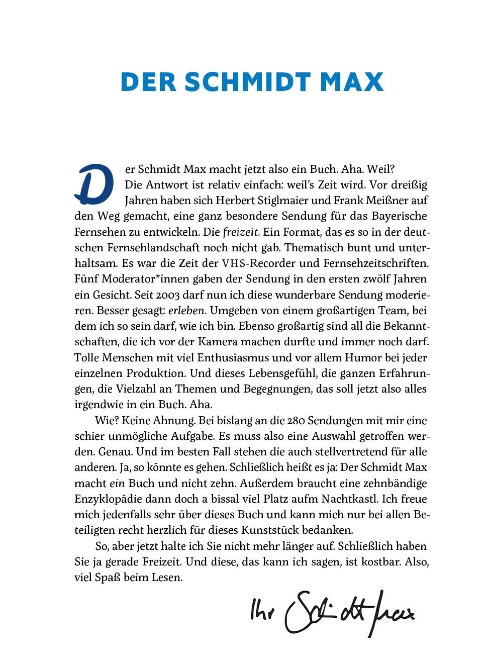 Der Schmidt Max macht ein Buch! Kult-Moderator Schmidt Max präsentiert seine schönsten Erlebnisse. Humorvoll, urig, informativ! Zum 30-jährigen Jubiläum des beliebten BR-Fernsehmagazins "freizeit" Man kennt ihn aus dem Fernsehen: den Schmidt Max, mit seinen unverwechselbaren Koteletten und dem charmanten bayerischen Zungenschlag. Er ist ein umtriebiger Lebenskünstler, der aber nie die nötige Ruhe verliert. Nun versammelt das Münchner Urgestein erstmals seine persönlichen Highlights als Moderator des BR-Magazins "freizeit" in einem Buch. Vom Eisschwimmen und Nostalgie-Skifahren übers Kräuterwandern, Schweinsbratenkochen und Zwetschgendatschibacken bis hin zum Selberbauen von Rodel, Uhr oder Sarg: 29 Kapitel bieten die schönsten Hintergründe, Anekdoten und Fotoaufnahmen zu den Themen: · Reisen · Natur · Sport · Kulinarik · Heimwerken