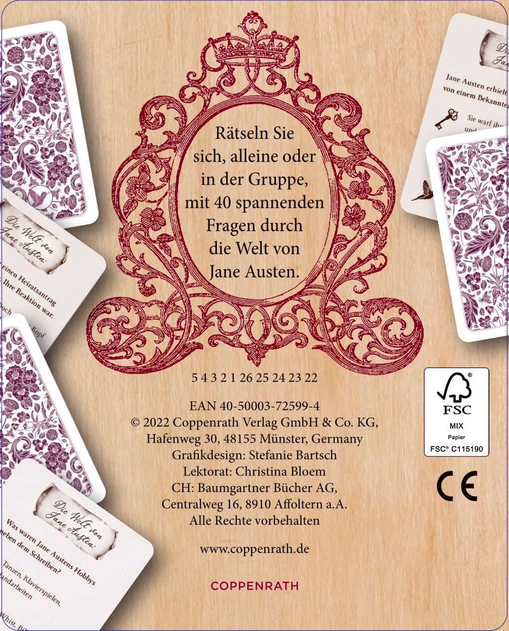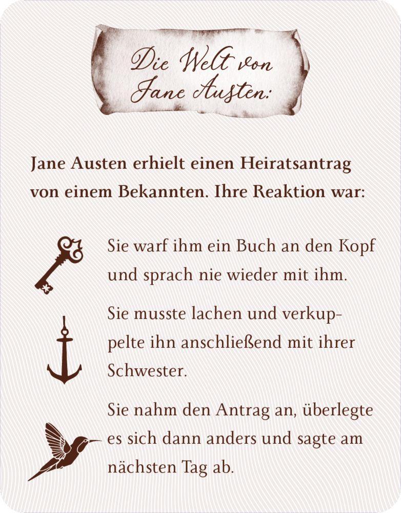Jane Austen gehört zu den berühmtesten Autorinnen der Weltliteratur. Aber was ist über die Autorin und ihre Werke tatsächlich bekannt? Amüsante Fragen rund um die Welt von Jane Austen und ihren Romanen sowie spannende Funfacts machen dieses Quiz zu einem perfekten Geschenk für alle Jane Austen Fans.