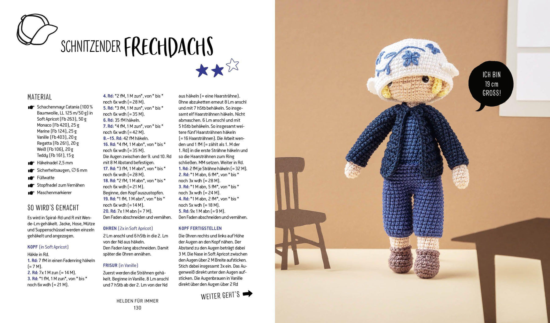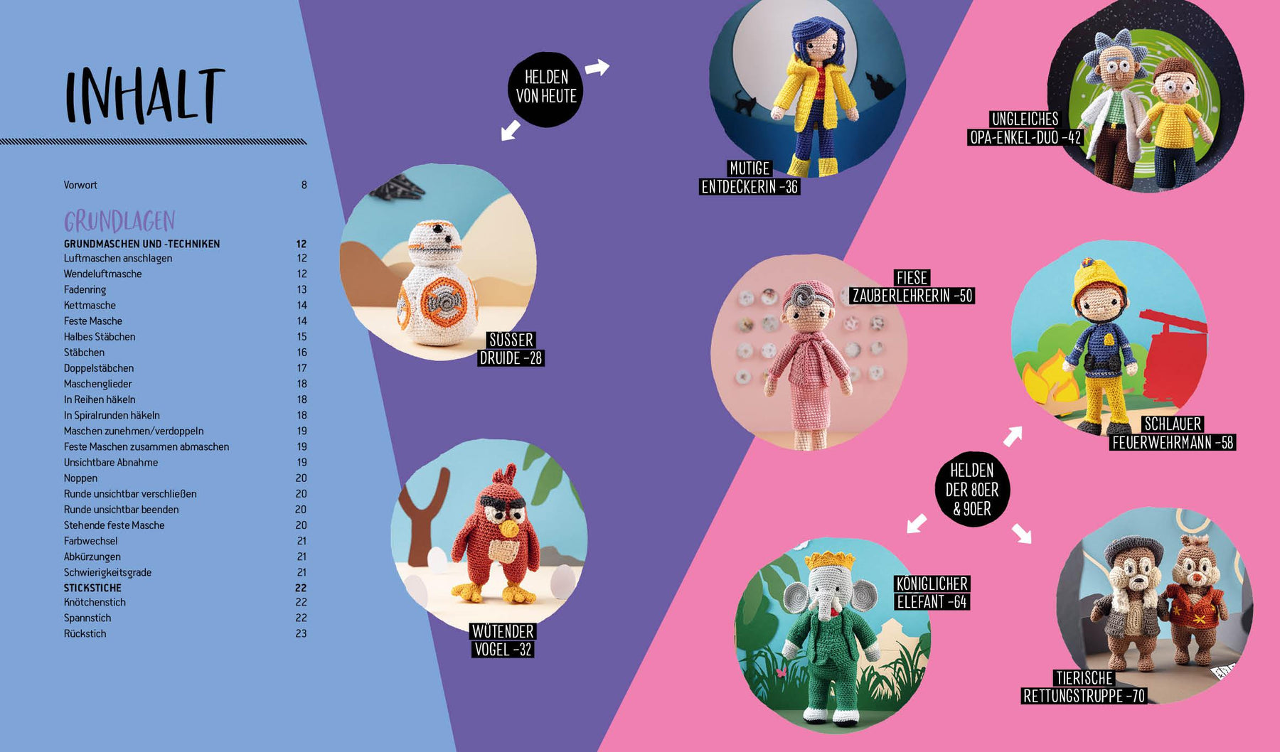 Nach einer Einführung in benötigte Materialien und verschiedene Häkeltechniken inklusive Illustrationen folgen schon die einzelnen Anleitungen für die Helden-Amigurumis. Materialangaben, Figurengröße und Schwierigkeitsgrade sind den Anleitungen beigefügt, so kann nichts schiefgehen.