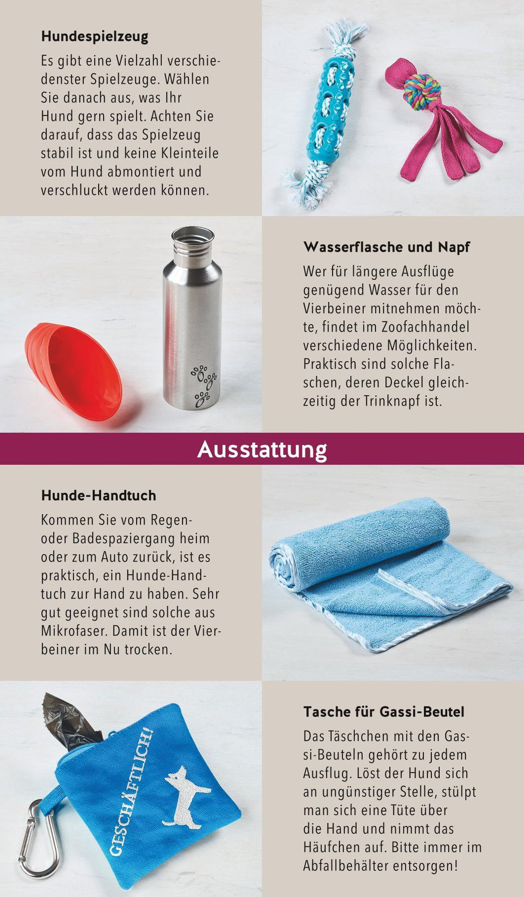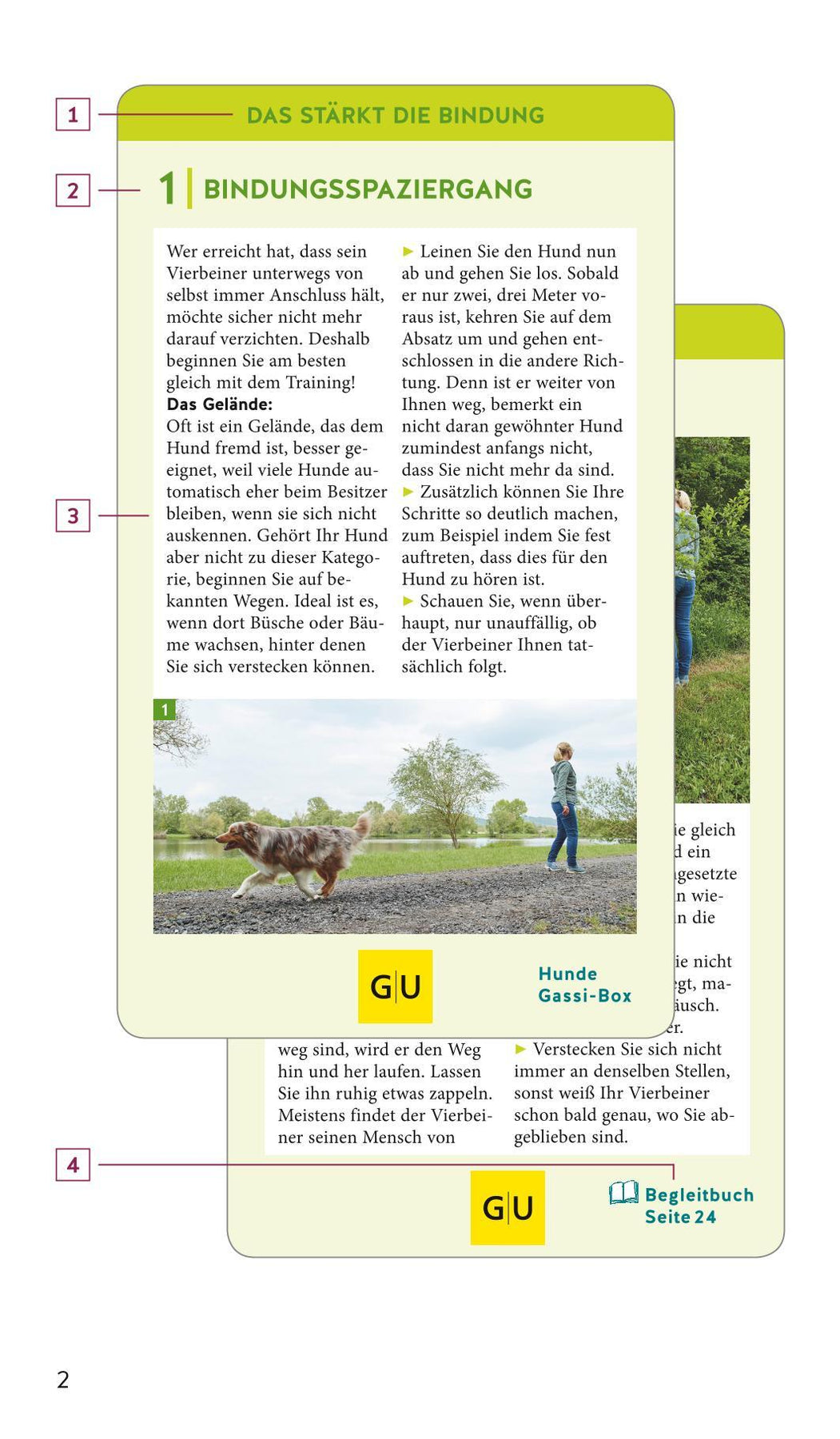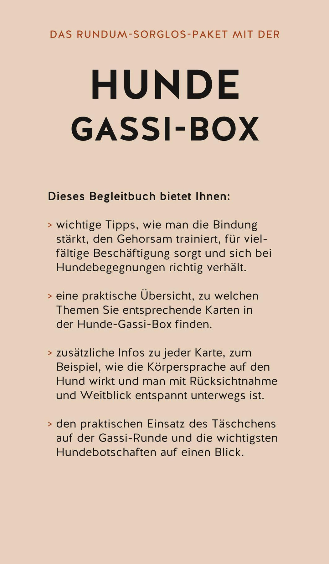 Die Hunde Gassi-Box zeigt mit 36 Übungskarten, wie man den eigenen Hund gut einschätzen lernt, vorausschauend unterwegs ist und Rücksicht auf andere nehmen kann. So kommt der Spaß und Wohlfühleffekt beim Gassi-Gang garantiert nicht zu kurz. Das Begleitbuch bietet alle wichtigen Grundinfos, um den Spaziergang mit Hund stressfrei zu genießen, etwa wie man sich bei Begegnungen mit anderen Menschen und Hunden richtig verhält. Außerdem findet man alles Nötige zur Grundausstattung für unterwegs - von Leine bis Belohnungshappen.