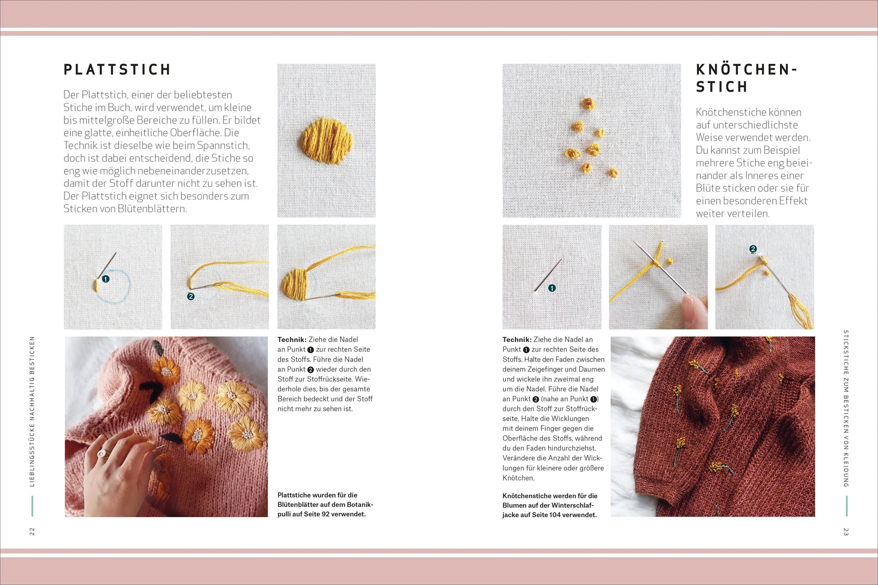 - Farbenfrohe Schritt-für-Schritt-Fotos erklären ausführlich jede Sticktechnik