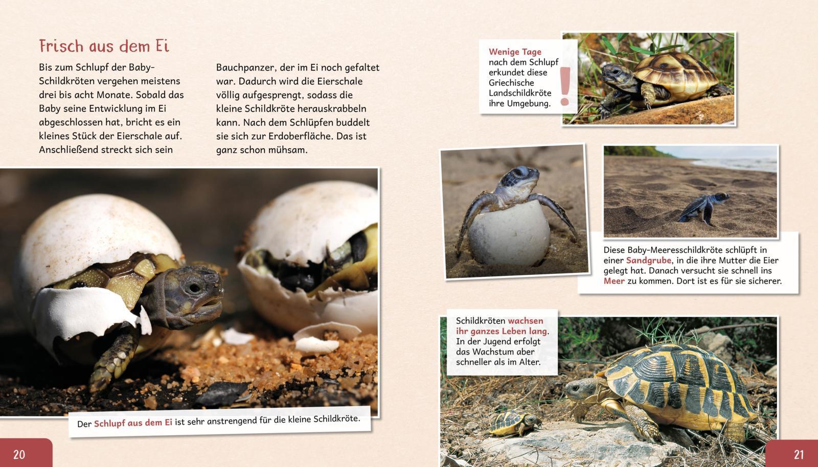 Die liebenswerten Reptilien sehen nicht nur aus wie Urzeittiere. Tatsächlich lebten Schildkröten schon zur Zeit der Dinosaurier! Ihr Panzer macht sie einzigartig im Tierreich. Schon beim Schlüpfen aus dem Ei beschützt er kleine Schildkröten. Und er wächst ein Leben lang mit! Manche Arten können sogar bis zu 200 Jahre alt werden. Hier erfährt man alles über das faszinierende Leben der Schildkröte - mit detailgenauen Fotos, kindgerechten Sachinformationen, einem Glossar und Schildkröten-Quiz.