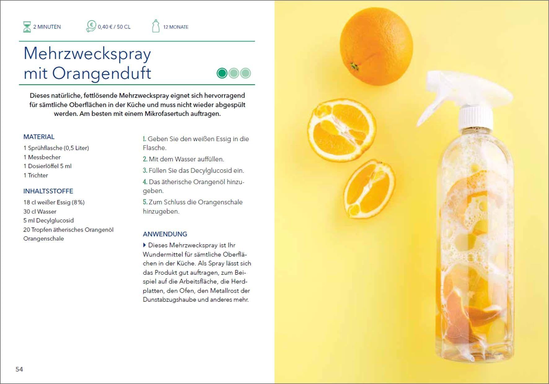 Selbst gemachte Reinigungsmittel schützen die Umwelt und die eigene Gesundheit. Séverine Jérigné hat 20 Rezepte für Haus und Garten, Bad, Küche und Wäsche zusammengestellt. Mit wenigen Zutaten können Sie Ihren eigenen Universalreiniger, ein Spülmittel, einen Raumduft oder eine Möbelpolitur herstellen.