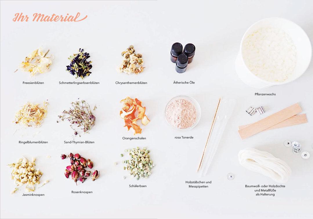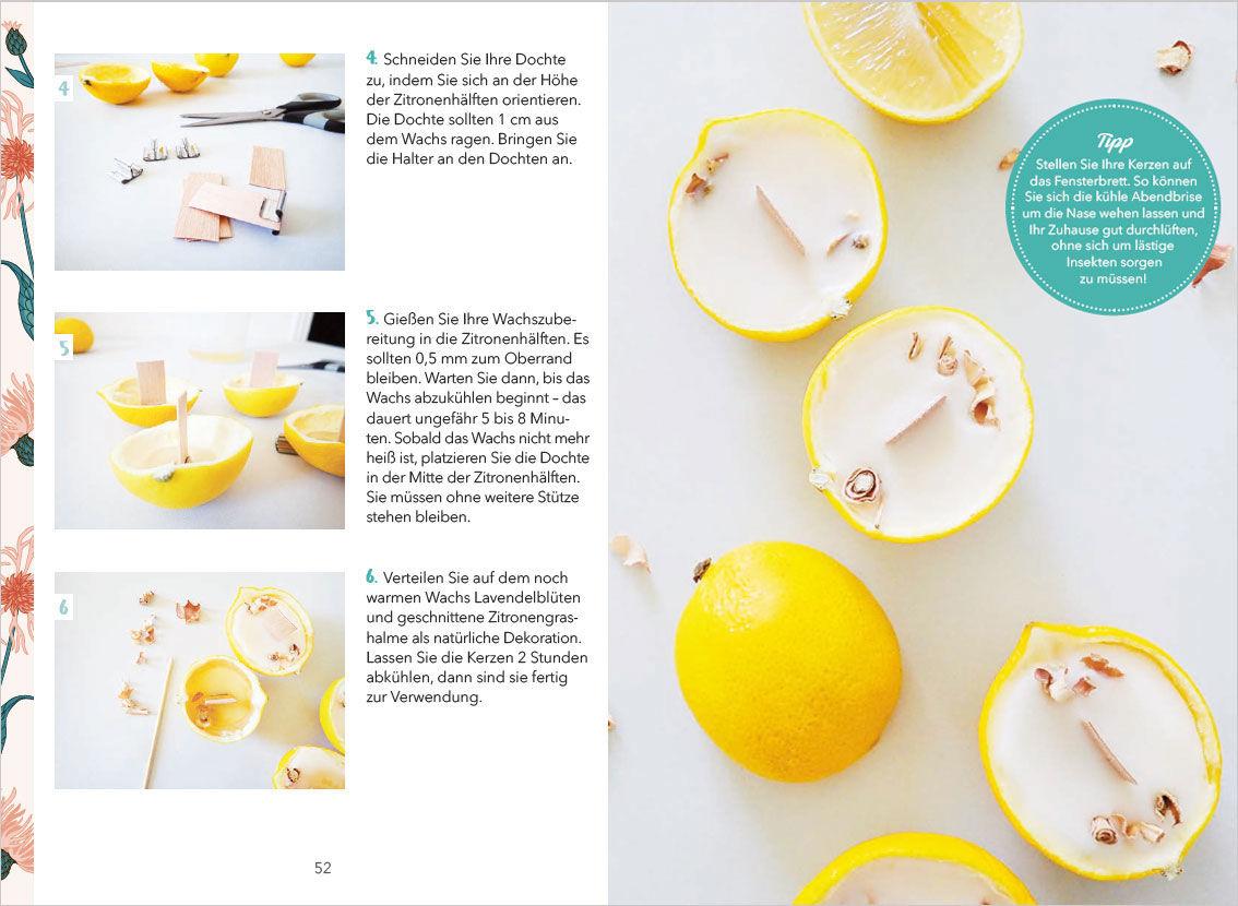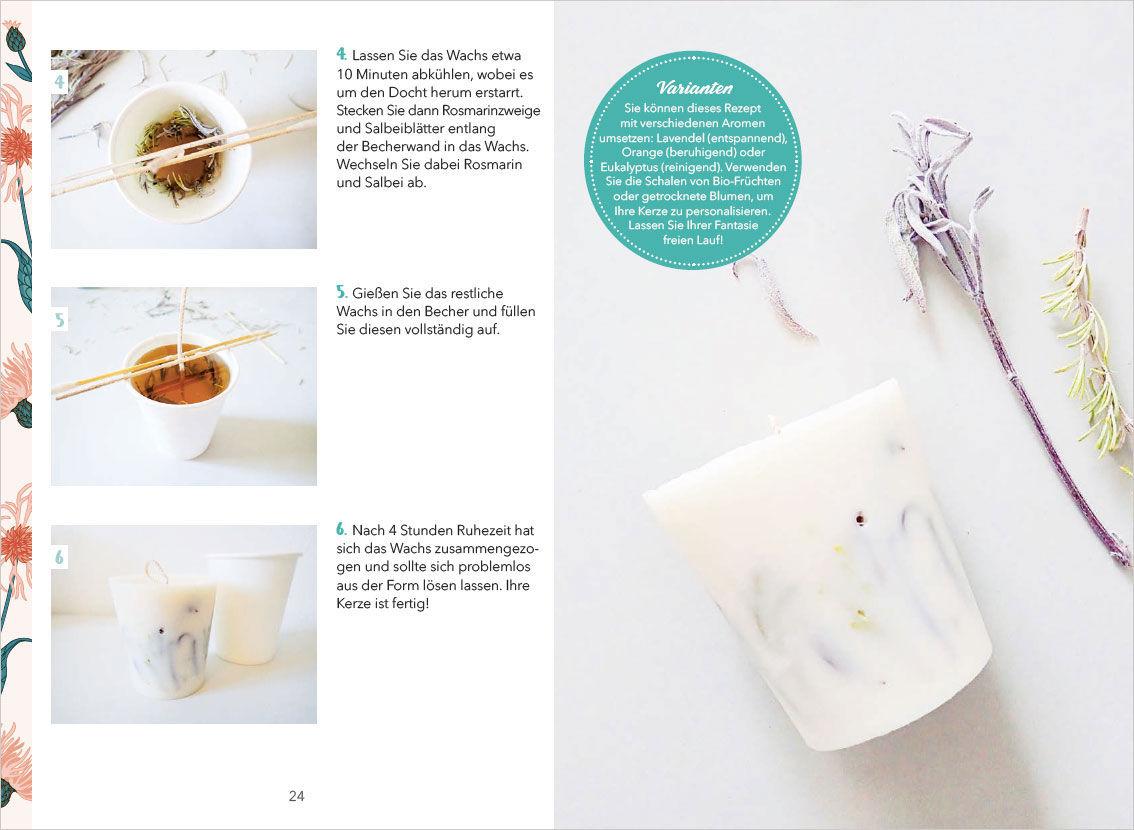 Bienen- oder Pflanzenwachs, ein Docht aus Holz oder Baumwolle, ein paar Tropfen ätherisches Öl und einige getrocknete Blüten zur Deko: Mehr Zutaten braucht es nicht, um eine Duftkerze herzustellen, die auf natürliche Weise die Raumluft erfrischt und zugleich ein hübsches Dekoelement ist. Schritt für Schritt wird gezeigt, wie 12 unterschiedliche Kerzen gegossen werden, die in ihrer Wirkung auf die Monate abgestimmt sind. Zur individuellen Anpassung gibt es zudem alternative Vorschläge für die Parfümierung und dekorative Gestaltung.