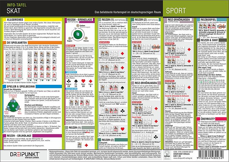 Erlernen auch Sie das beliebteste Kartenspiel im deutschsprachigen Raum: Skat! Mit vielen Beispielen und Abbildungen führt Sie diese zweiseitige Info-Tafel erst an die Grundlagen des Spiels und des Spielablaufs, um dann anhand von Musterabläufen Feinheiten und erste Taktiken zu erläutern. Die Faszination dieses Kartenspiels ist seit Generationen ungebrochen - erlernen Sie es noch heute! Die wasserfest laminierte Info-Tafel hält dabei auch starken Belastungen über Jahre hinweg stand und kann bei Bedarf sogar mit einem abwischbaren Overheadstift beschriftet werden (nicht im Lieferumfang enthalten).