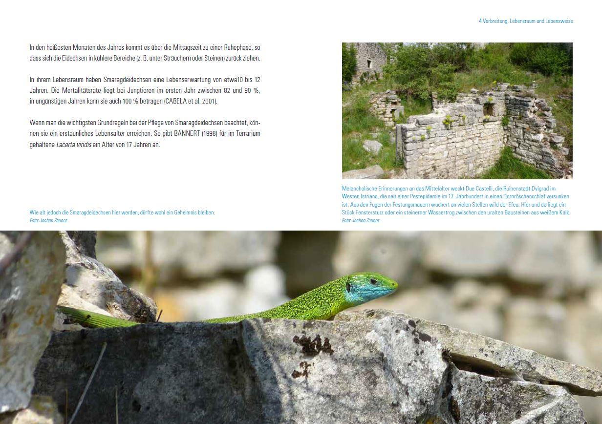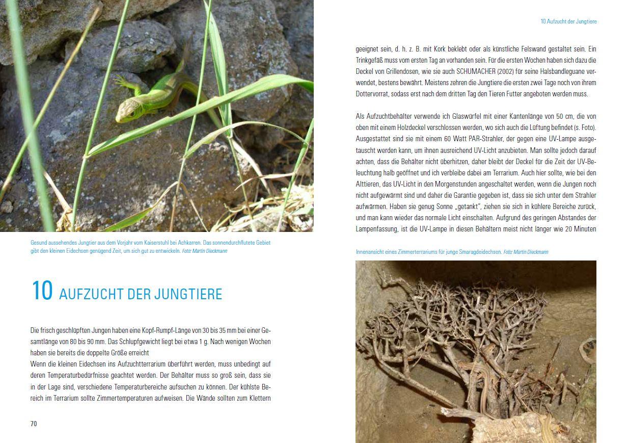 Für Martin Dieckmann zählen Smaragdeidechsen bis heute zu seiner großen Leidenschaft. Im vorliegenden Buch informiert er ausführlich über die Pflege, Zucht und Beobachtungen im natürlichen Lebensraum. Wunderschöne Aufnahmen aus den unterschiedlichen Biotopen sollen dem begeisterten Leser die Lebensweise dieser Reptilien näher bringen. Zahlreiche Fotos und Informationen z. B. über die Haltung in einer strukturierten Freilandanlage machen das Buch zu einer interessanten Monografie über diese Eidechsengruppe. Der Autor befasst sich seit seiner Kindheit mit Amphibien und Reptilien. Schon bald pflegte er seine erste Strumpfbandnatter. Es folgten eine Reihe weiterer Schlangenarten, darunter auch einige mitteleuropäische Arten, die er hauptsächlich in Freilandterrarien pflegte. Später kamen dann die einheimischen Eidechsen hinzu, die er alle im Freilandterrarium erfolgreich vermehren konnte. Bis heute fasziniert ihn die europäische Herpetofauna, die er auf vielen Reisen in unterschiedliche Länder kennen lernen konnte.