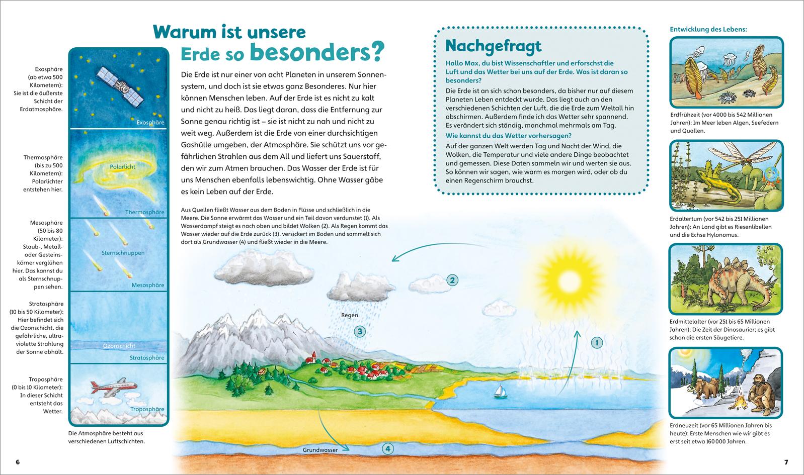 Wie alt ist der blaue Planet Erde? Wieso gibt es Tag und Nacht? Und warum ist es am Nordpol so kalt? Komplizierte Begriffe wie "Urknall", "Erdatmosphäre" oder "Wasserkreislauf" werden Kindern ab 4 Jahren anschaulich erklärt und auch Erstleser werden für sich noch Neues entdecken. Entdecker-Klappen, kleine Rätsel und Spiele, die Rubrik "Unglaublich" und eine witzige kleine Erdkugel, die sich auf jeder Doppelseite versteckt hält, sorgen für spielerische Momente.