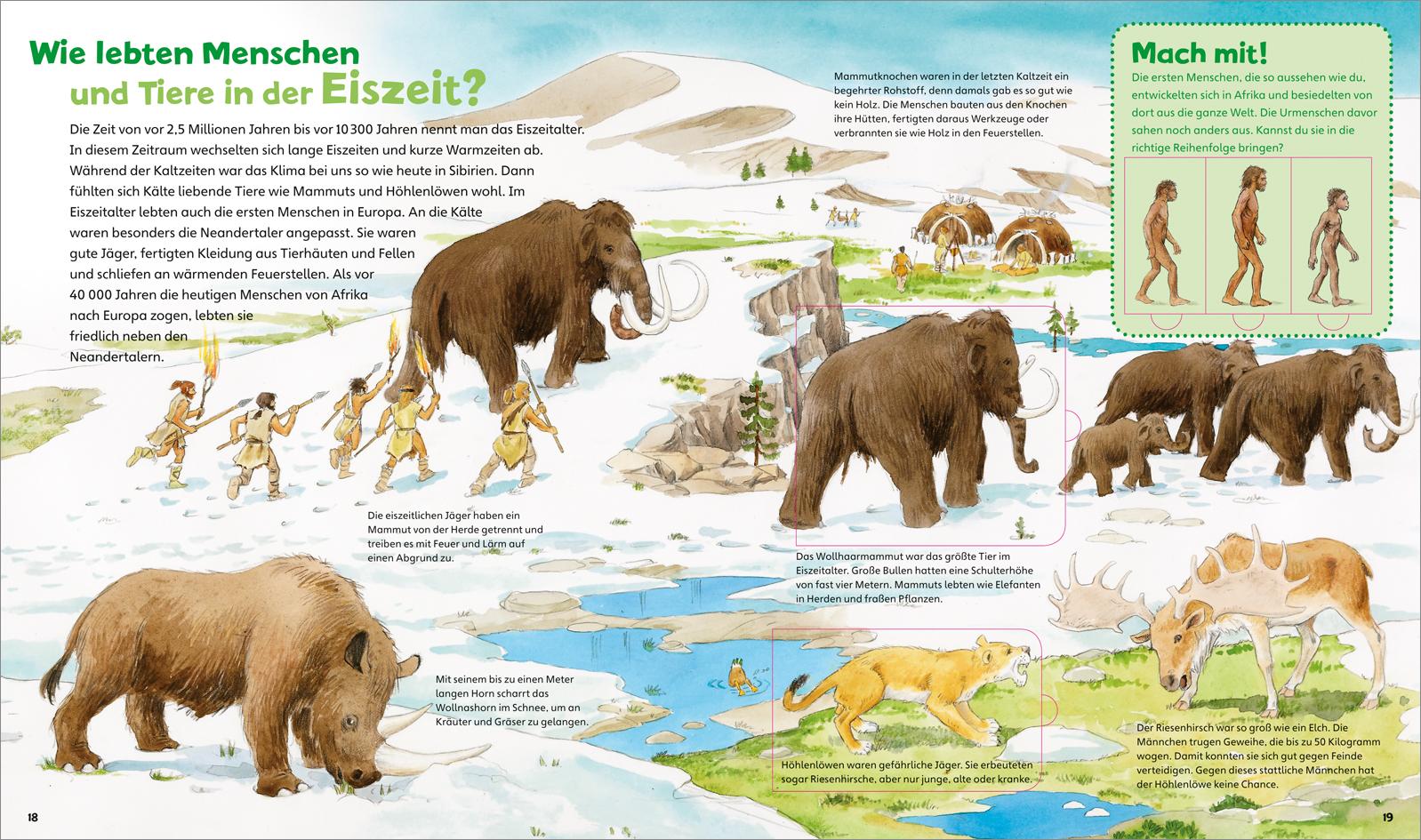 Das Thema des Junior-Bandes umfasst nicht weniger als 450 Millionen Jahre! Wir sind dabei, als aus dem Meer riesige Tiere an Land kommen, aus denen später die Dinosaurier werden. Wie sehen sie aus, wie leben sie? Was macht ihre riesige Vielfalt aus, und warum können sie doch nicht überleben? Der zweite Teil nicht minder spannend: Die Urzeittiere, Urnashorn und Feuertier, Säbelzahnkatze und Mammuts sind legendär. Was gibt es über sie an gesichertem Wissen? Entdecker-Klappen, erstaunliche Rekorde, kleine Rätsel und Spiele flankieren den abenteuerlichen Weg durch die Zeiten.