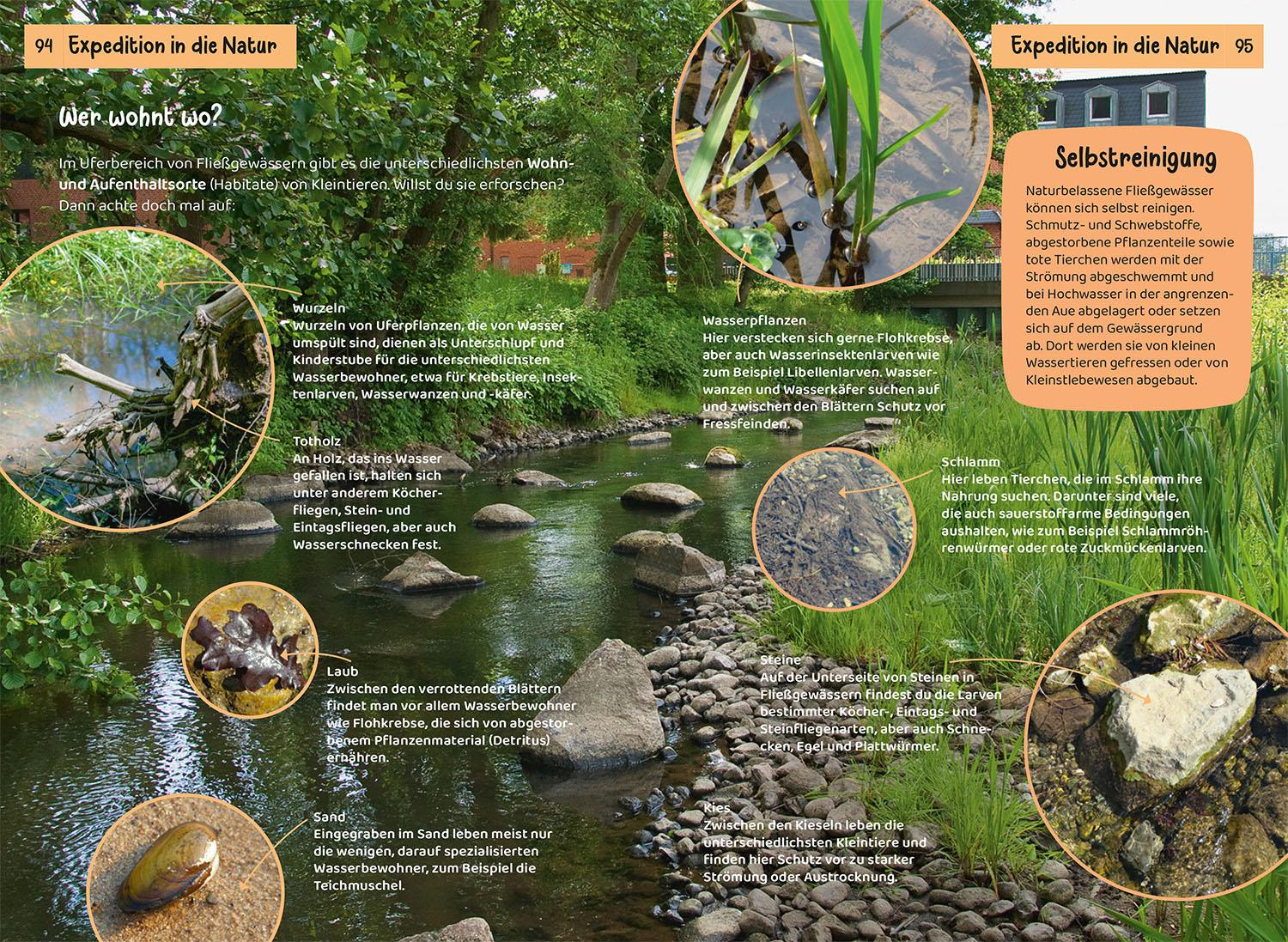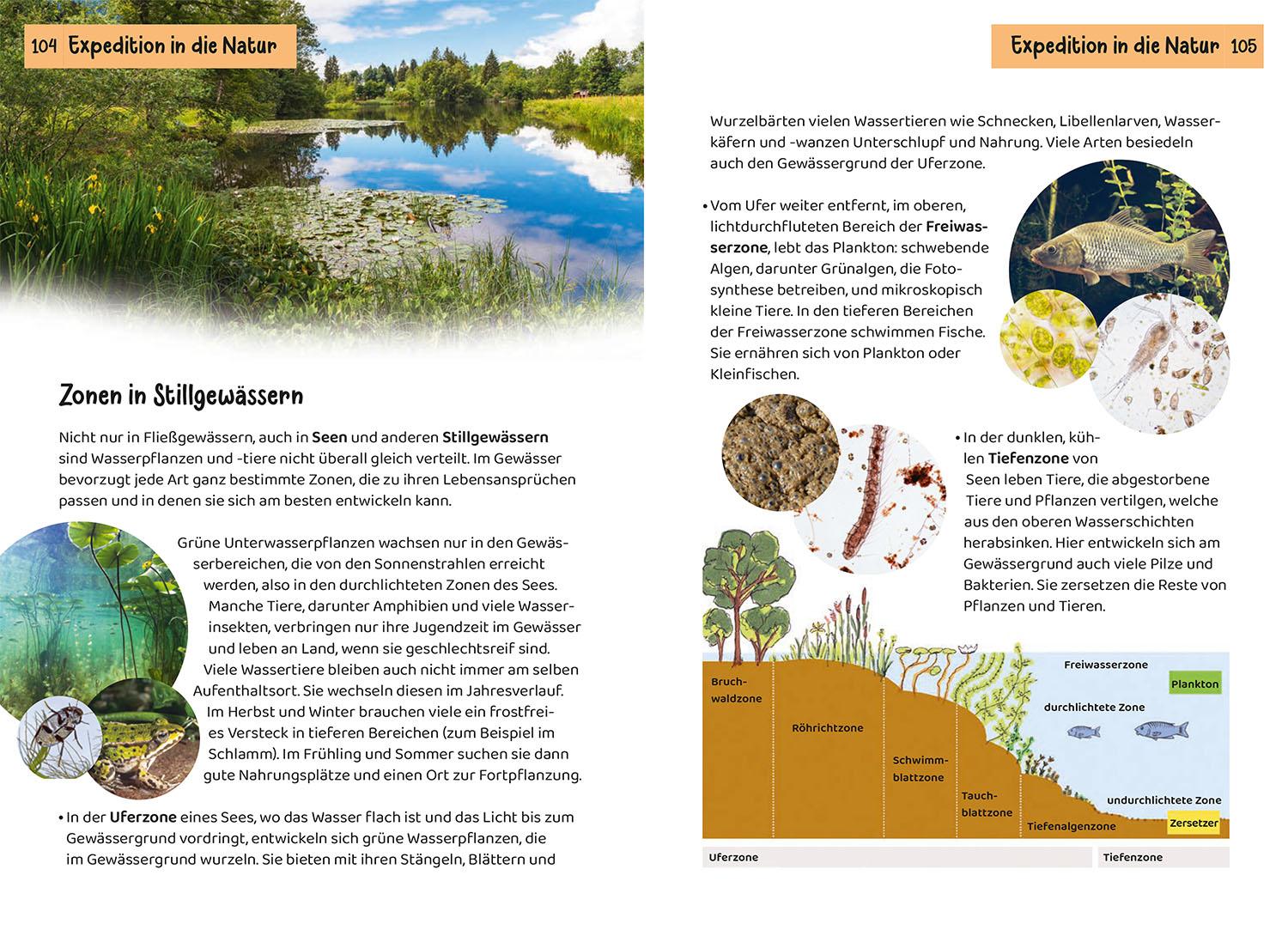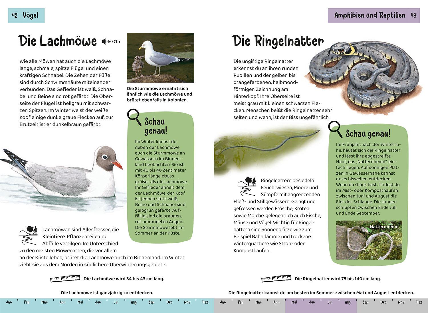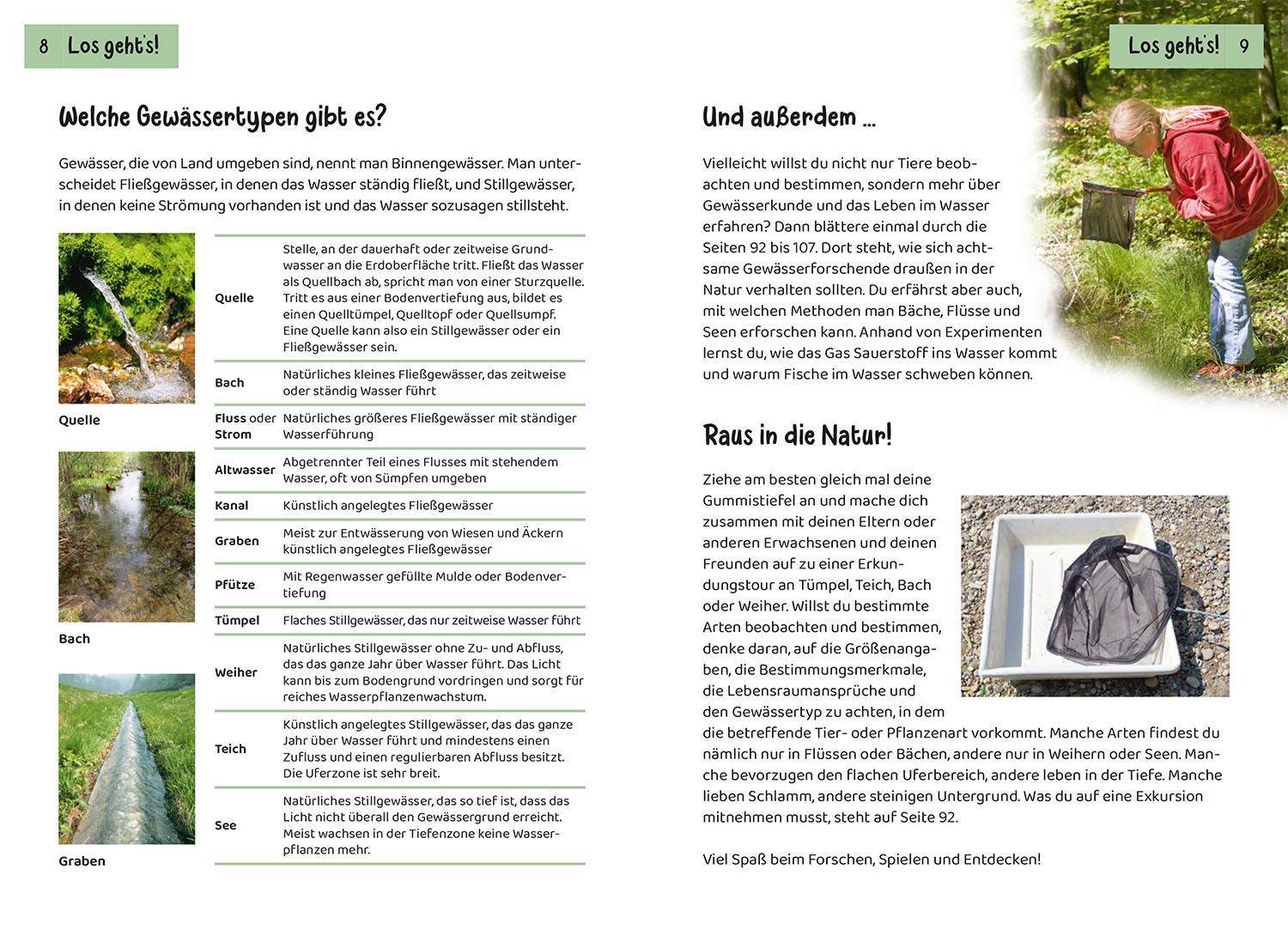 Viele Lebewesen und Pflanzen leben an Bach und Teich. Sie zu bestimmen macht großen Spaß. Staudämme bauen, mit dem Kescher Kaulquappen sammeln und Wasserproben entnehmen. Welche Säugetiere, Vögel, Reptilien Spinnen, Schnecken, Muscheln und Pflanzen fühlen sich am und im Wasser wohl? Schnell nachschlagen! 85 Arten stellt der Kindernaturführer vor. Die Kapitel sind nach Farben sortiert. So kann sich jeder schnell im Buch zurechtfinden. Mit schönen Illustrationen, Fotos, Tipps, Experimenten und Sachinformationen. Rausgehen und die Natur in ihrer Vielfalt erkunden. Ein wunderbares Nachschlagewerk auch für Referate. Kompetent und kindgerecht stellt dieser Naturführer für Kinder die faszinierende Welt Bach und Teich vor. Empfohlen vom NABU.