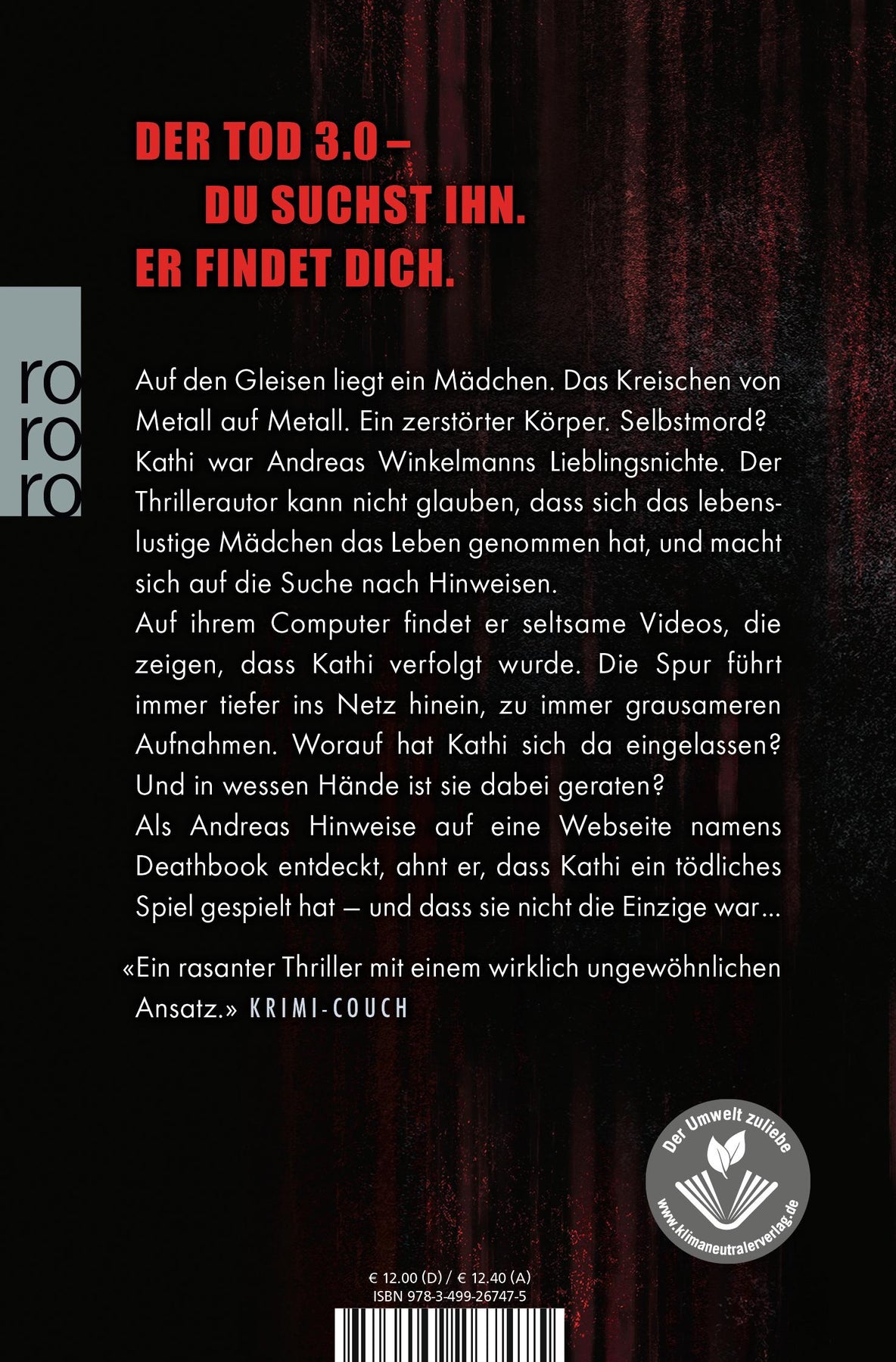 Auf ihrem Computer findet er seltsame Videos, die zeigen, dass Kathi verfolgt wurde. Die Spur führt immer tiefer ins Netz hinein, zu immer grausameren Aufnahmen. Worauf hat Kathi sich da eingelassen? Und in wessen Hände ist sie dabei geraten? Als Andreas Hinweise auf eine Webseite namens Deathbook entdeckt, ahnt er, dass Kathi ein tödliches Spiel gespielt hat - und dass sie nicht die Einzige war ...