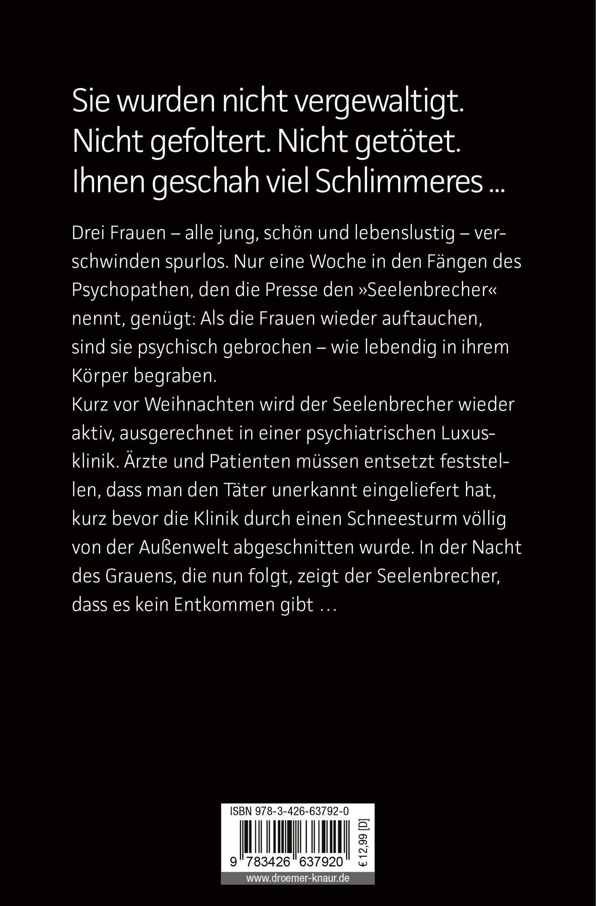 Drei Frauen - alle jung, schön und lebenslustig - verschwinden spurlos. Nur eine Woche in den Fängen des Psychopathen, den die Presse den 'Seelenbrecher' nennt, genügt: Als die Frauen wieder auftauchen, sind sie psychisch gebrochen - wie lebendig in ihrem Körper begraben. Kurz vor Weihnachten wird der Seelenbrecher wieder aktiv, ausgerechnet in einer psychiatrischen Luxusklinik. Ärzte und Patienten müssen entsetzt feststellen, dass man den Täter unerkannt eingeliefert hat, kurz bevor die Klinik durch einen Schneesturm völlig von der Außenwelt abgeschnitten wurde. In der Nacht des Grauens, die nun folgt, zeigt der Seelenbrecher, dass es kein Entkommen gibt ...