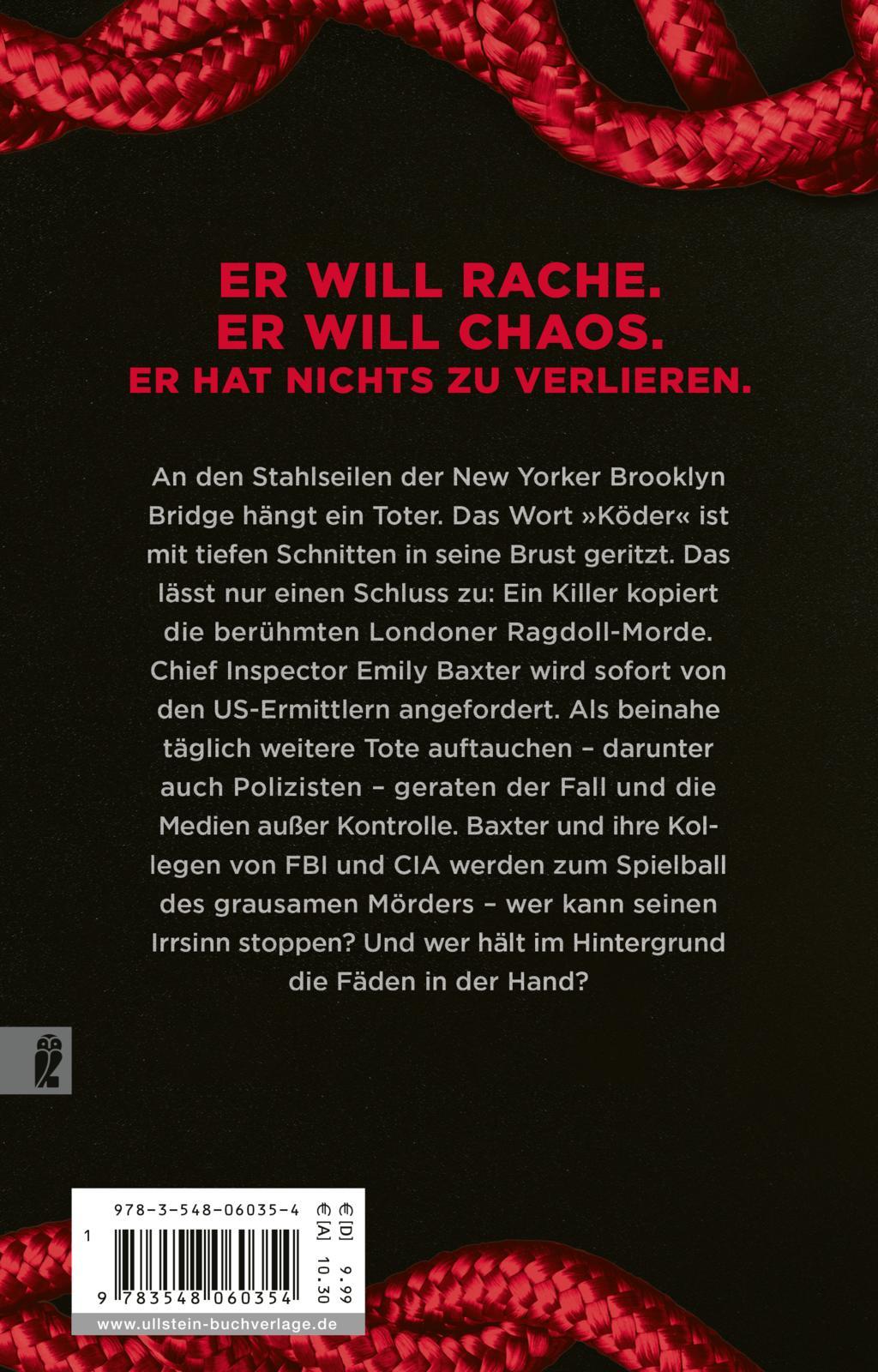 An den Stahlseilen der New Yorker Brooklyn Bridge hängt ein Toter. Das Wort 'Köder' ist mit tiefen Schnitten in seine Brust geritzt. Das lässt nur einen Schluss zu: Ein Killer kopiert die berühmten Londoner Ragdoll-Morde. Chief Inspector Emily Baxter wird sofort von den US-Ermittlern angefordert. Als beinahe täglich weitere Tote auftauchen - darunter auch Polizisten - geraten der Fall und die Medien außer Kontrolle. Baxter und ihre Kollegen von FBI und CIA werden zum Spielball des grausamen Mörders - wer kann seinen Irrsinn stoppen? Und wer hält im Hintergrund die Fäden in der Hand?