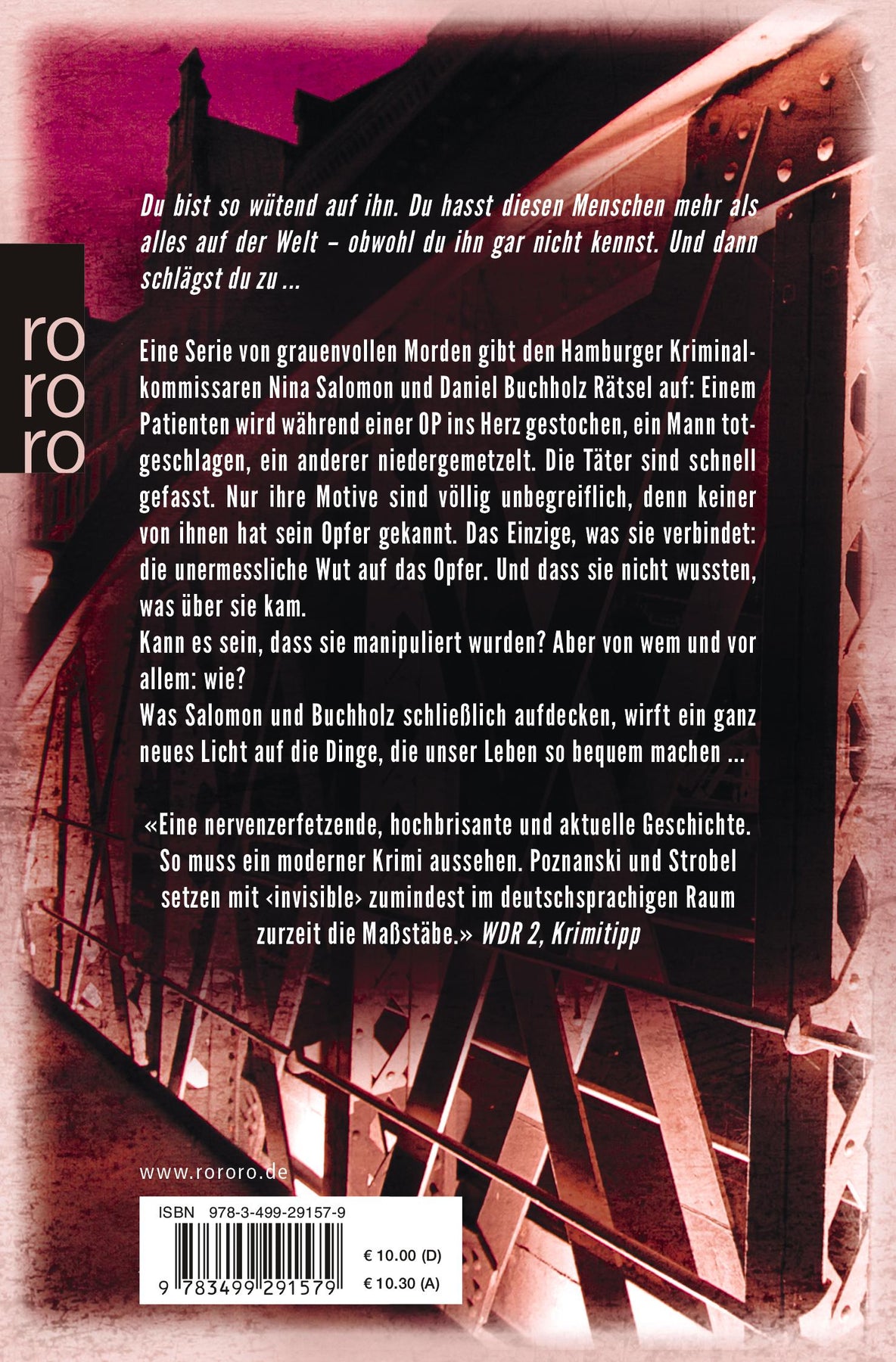 Eine Serie von grauenvollen Morden gibt den Hamburger Kriminalkommissaren Nina Salomon und Daniel Buchholz Rätsel auf: Einem Patienten wird während einer OP ins Herz gestochen, ein Mann totgeschlagen, ein anderer niedergemetzelt...Die Täter sind schnell gefasst. Nur ihre Motive sind völlig unbegreiflich, denn keiner von ihnen hat sein Opfer gekannt. Das einzige, was sie verbindet: Die unermessliche Wut auf das Opfer. Und dass sie nicht wussten, was über sie kam.