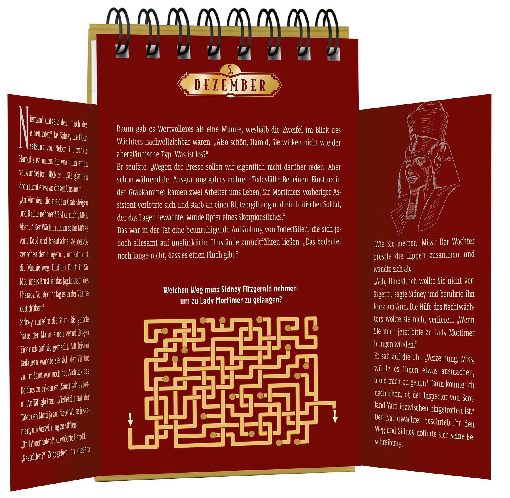 Jeden Tag weiter Lesen und Rätseln: Der dekorative Adventskalender für erwachsene Leserinnen und Rätselfreunde zum Aufstellen verbirgt hinter jeder der 24 Pforten ein weiteres Kapitel des atmosphärisch-nostalgischen Kriminalfalls und ein passendes Rätsel.