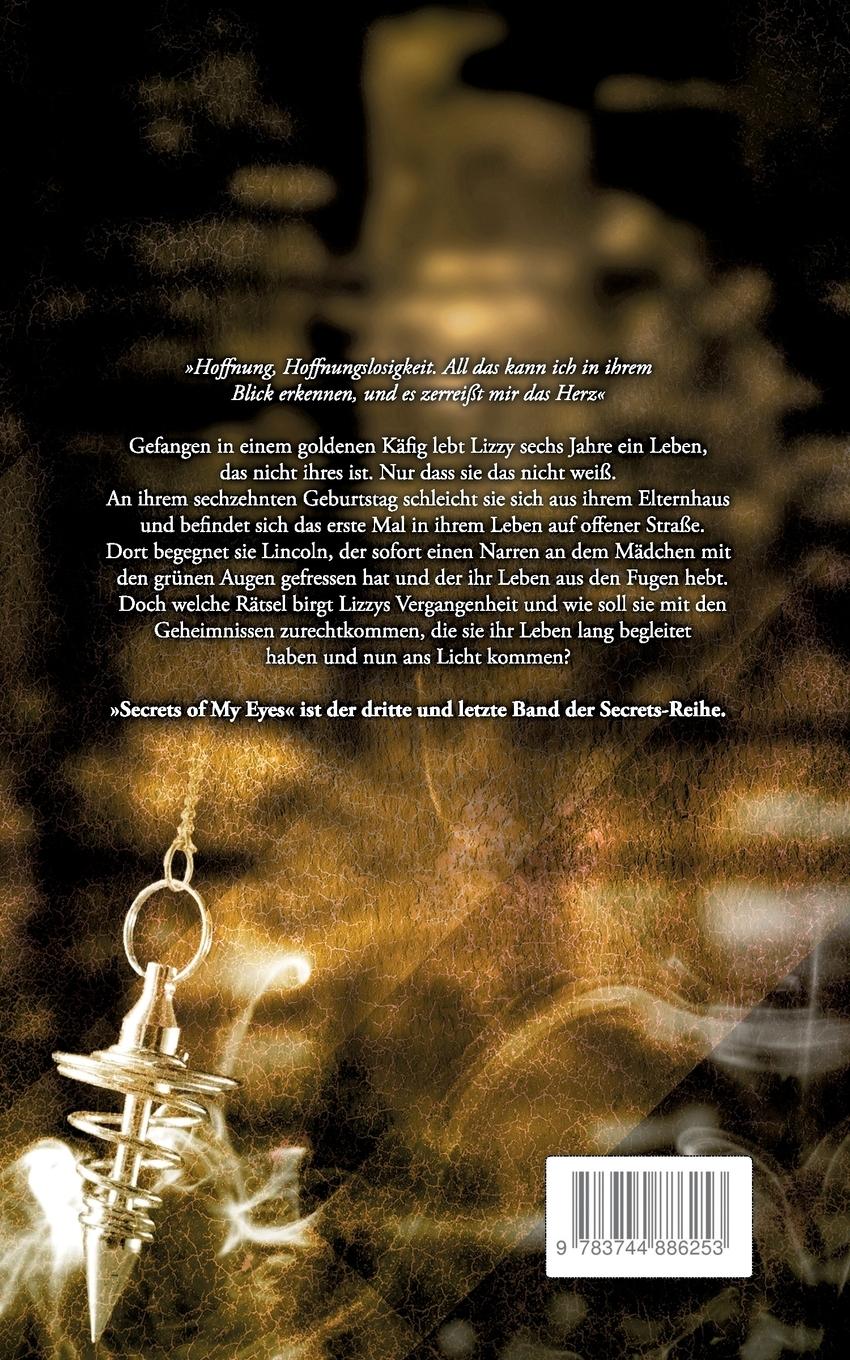 'Hoffnung, Hoffnungslosigkeit. All das kann ich in ihrem Blick erkennen, und es zerreißt mir das Herz' Gefangen in einem goldenen Käfig lebt Lizzy sechs Jahre ein Leben, das nicht ihres ist. Nur dass sie das nicht weiß. An ihrem sechzehnten Geburtstag schleicht sie sich aus ihrem Elternhaus und befindet sich das erste Mal in ihrem Leben auf offener Straße. Dort begegnet sie Lincoln, der sofort einen Narren an dem Mädchen mit den grünen Augen gefressen hat und der ihr Leben aus den Fugen hebt. Doch welche Rätsel birgt Lizzys Vergangenheit und wie soll sie mit den Geheimnissen zurechtkommen, die sie ihr Leben lang begleitet haben und nun ans Licht kommen? 'Secrets of My Eyes' ist der dritte und letzte Band der Secrets-Reihe.
