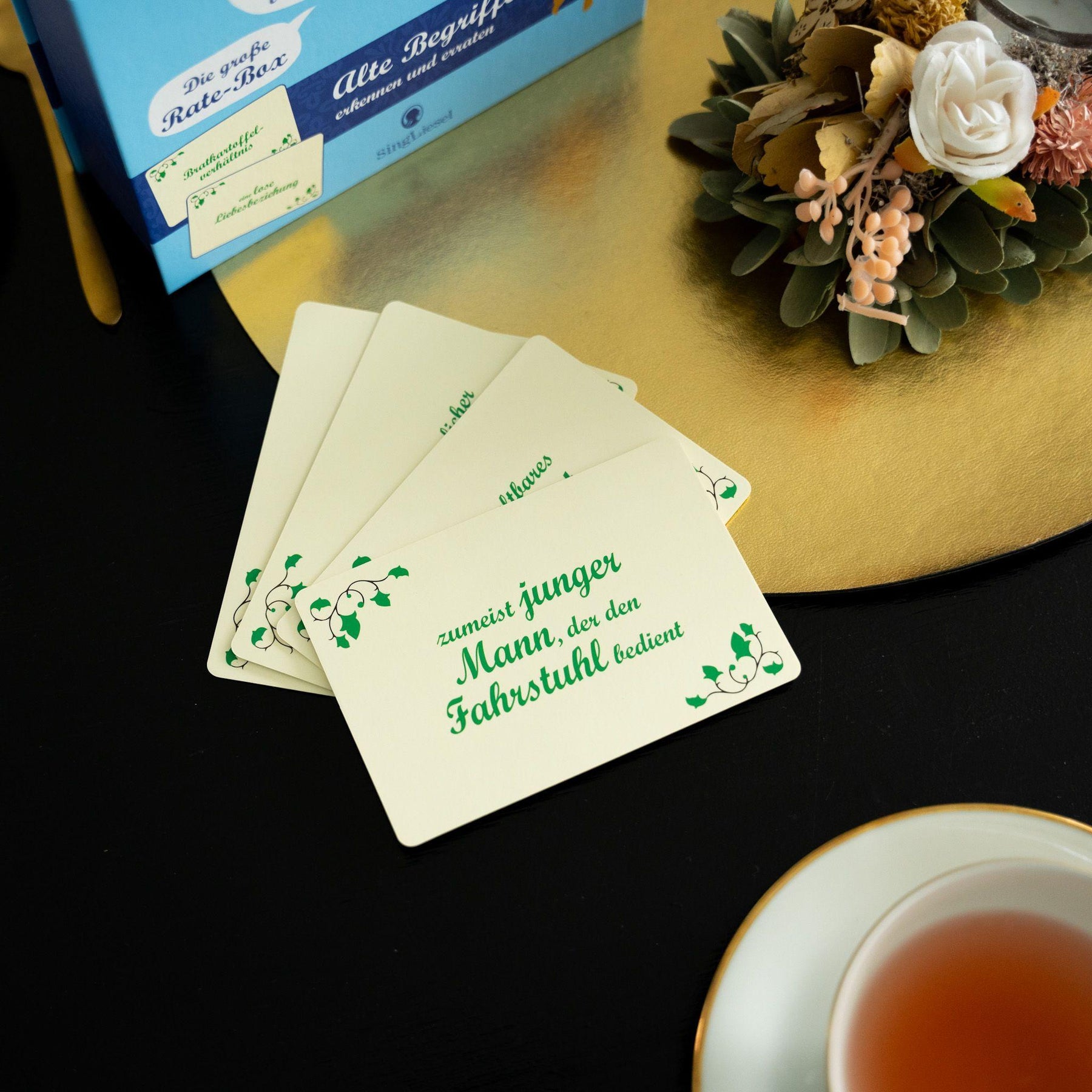Die Spielidee ist einfach und bereitet deshalb immer wieder von Neuem großen Spaß: Auf der Vorderseite der Karten steht ein heute kaum mehr geläufiger Begriff. Überlegen Sie gemeinsam, wofür dieser Begriff stehen könnte.