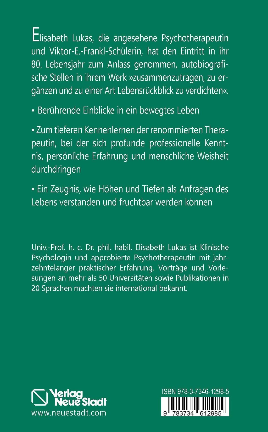 Authentisch · bewegend · bedenkenswert Zum 80. Geburtstag der renommierten Therapeutin Zahllosen Menschen hat Elisabeth Lukas, die renommierte Psychotherapeutin und Viktor-E.-Frankl-Schülerin, beratend und helfend zur Seite gestanden - und sie tut es bis heute. Anlässlich ihres bevorstehenden 80. Geburtstags im November 2022 hat sie autobiografische Auszüge aus ihren zahlreichen Publikationen systematisch zusammengestellt und ergänzt. Ein Buch voller erfahrungsgesättigter Orientierung in unübersichtlichen, herausfordernden Zeiten. ¿ Berührende Einblicke in ein bewegtes Leben ¿ Ein wegweisendes Zeugnis, wie Höhen und Tiefen als Anfragen des Lebens verstanden und fruchtbar werden können ¿ Zum tieferen Kennenlernen der bedeutenden Therapeutin, bei der sich profunde professionelle Kenntnis und menschliche Erfahrung und Weisheit durchdringen