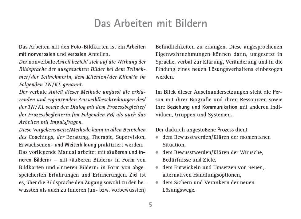 Wirksames Stressmanagement Stress ist ein hochaktuelles Thema im Rahmen von Coaching, Beratung und Therapie. Das Arbeiten mit Foto-Bildkarten bietet hier effektive und entspannte Methoden im ressourcenorientierten Stressmanagement. Durch die individuelle Auswahl der Bildkarten wird ein Prozess der Wahrnehmung, Klärung und Veränderung aktiviert und so das Prozessgeschehen der Stressbewältigung angestoßen: effektiv, lösungsfördernd und ressourcenorientiert! Die methodischen Grundlagen sind in der beiliegenden Broschüre schnell nachzulesen, sodass die Bildkarten direkt einsatzbereit sind.