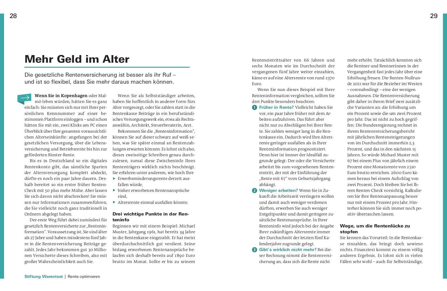 Die Stiftung Warentest-Experten geben Tipps, wie Sie zum Beispiel aus Riester-, Rürup- und Betriebsrente das Maximum herausholen und auch mit wenig Geld für eine Zusatzrente sparen können. Sollte Ihr lang gehegter Traum das Leben in der eigenen Immobilie sein, zeigen Ihnen die Experten, wie sie diesen verwirklichen können. Wollen Sie das eigene Vermögen mit cleveren Anlagen vermehren, erfahren Sie in diesem Handbuch alles zu den empfehlenswertesten Aktiendepots.