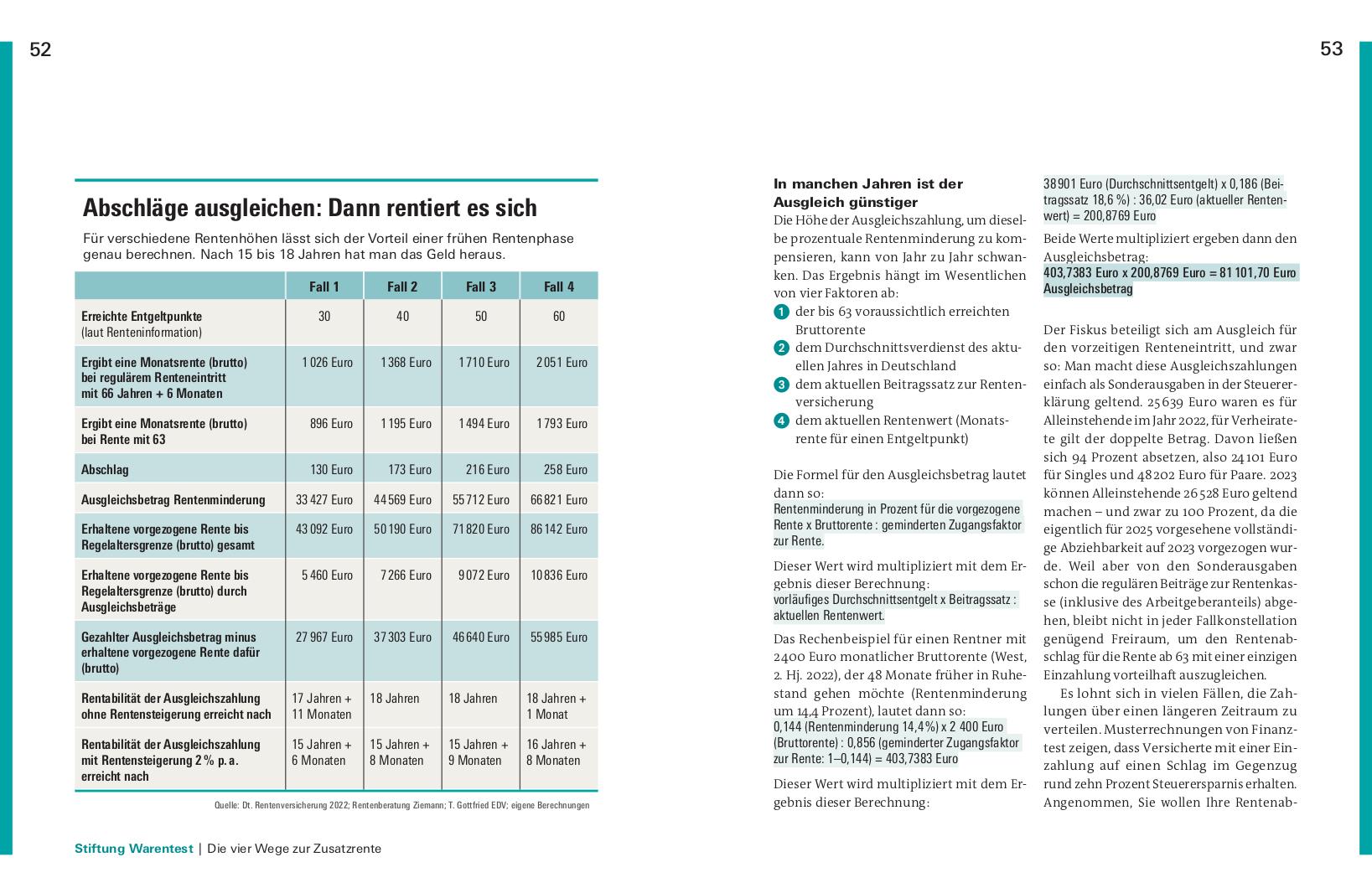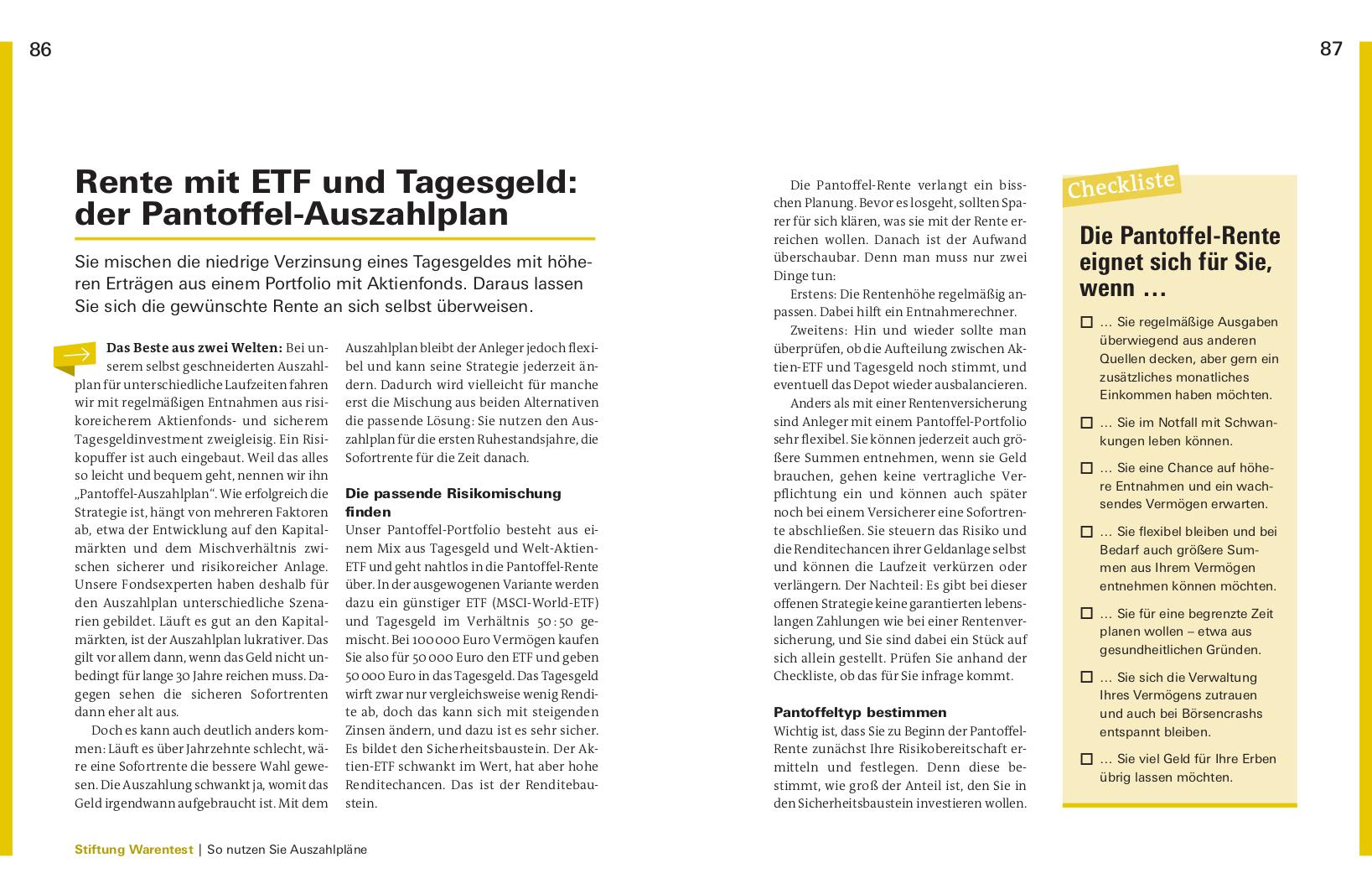 Die Rentenexpertinnen und -experten der Stiftung Warentest liefern mit Beispielrechnung und nützlichen Checklisten verständliches Wissen, um Ihren neuen Lebensabschnitt zu gliedern. Es gibt vier Wege zur Aufstockung Ihres Ruhegeldes. Der erste Weg ist es, sich einen Überblick über die eigenen Finanzen zu verschaffen. Erst mit dem Aufspüren von Vermögenswerten lässt sich sinnvoll eine Zusatzrente planen. Der zweite Weg sind Kapitalanlagen, deren Zinsen, Dividenden oder Gewinne über eine Sofortrente oder einen Auszahlplan ausgeschüttet werden können. Auch Immobilien lassen sich in eine Rente umwandeln, genauso wie Sachwerte durch Verleih oder Vermietung.