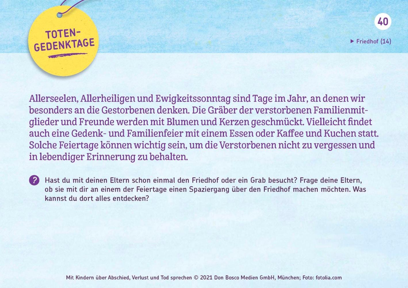 - Schlagworte: Vorschule und Kindergarten, Grundschule und Sekundarstufe I, Unterrichtsmaterialien, Umgang mit / Ratgeber zu Tod und Trauer, Ratgeber für Eltern und Elternschaft: Themen und Fragen, Kinder/Jugendliche: Persönliche und soziale Themen: Tod und T.....