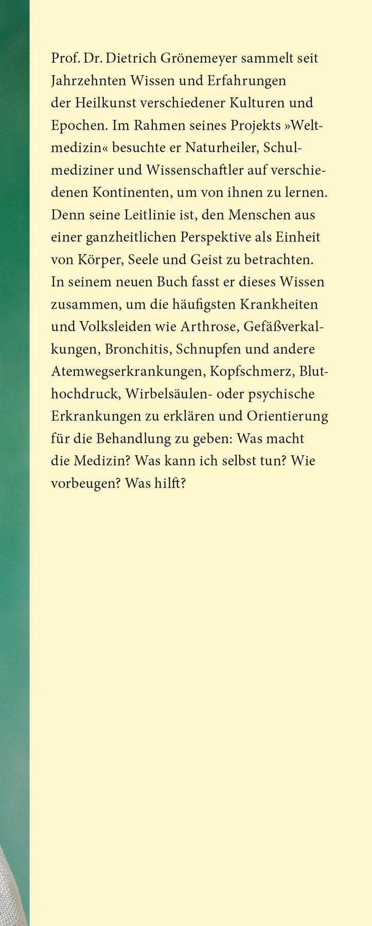 Seit über 40 Jahren widmet sich Grönemeyer der Heilung von Menschen und bezieht dabei alle bewährten Methoden aus aller Welt mit ein, von traditionellen Naturheilverfahren bis zu modernsten schulmedizinischen Techniken. Denn am Ende zählt nicht der Triumph einer bestimmten "Schule", sondern die Gesundheit des Patienten. Fundiert und allgemeinverständlich führt dieses wegweisende Werk zusammen, was zusammengehört: "Erfahrung und Fortschritt, Schulmedizin und Naturheilkunde für die Weltgesundheit."