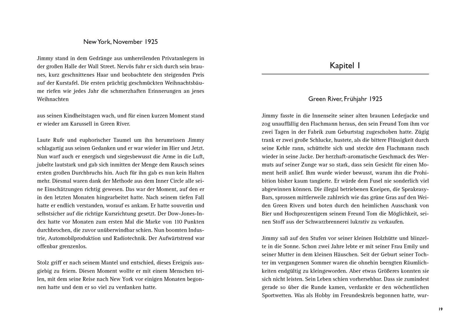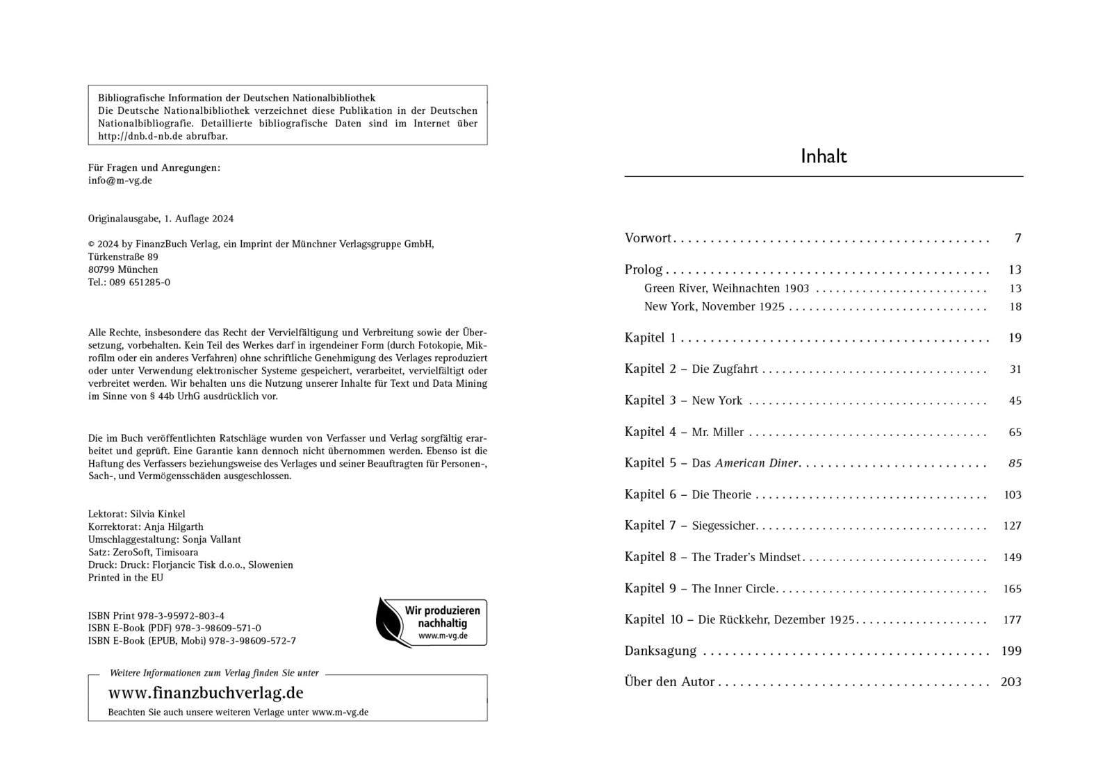 Für erfolgreiches Trading braucht man klare Strategien, ein fundiertes Marktverständnis und ein starkes Mindset. The True Trader erzählt die mutige Heldenreise des jungen Jimmy, der gegen die Schatten seiner Vergangenheit kämpft, um sich und seiner Familie im New York der 1920er-Jahre ein neues Leben aufzubauen. Während der Prohibition treibt ihn der hypnotische Rhythmus des Charleston in verbotene Speakeasy-Bars. Doch noch mehr fasziniert ihn die euphorisierende boomende US-Wirtschaft und der kollektive Glaube an endlos steigende Aktienkurse. So zieht es ihn immer weiter an die Wall Street und in einen geheimnisvollen Inner Circle. Auf seiner Reise trifft er auf wichtige Mentoren, aber er kämpft auch gegen Hochstapler und zahlreiche Hindernisse - vor allem gegen seinen größten Gegner: Seine frühere Identität. Ein faszinierender Roman über das New York der 1920er-Jahre und über den Weg eines jungen Börsenhändlers, der nicht nur Spannung bietet, sondern auch wichtige Tipps und Weisheiten für angehende Trader bereithält.