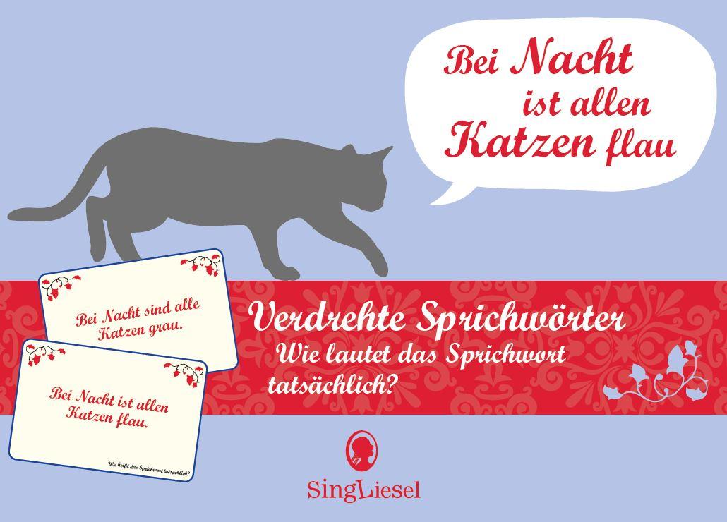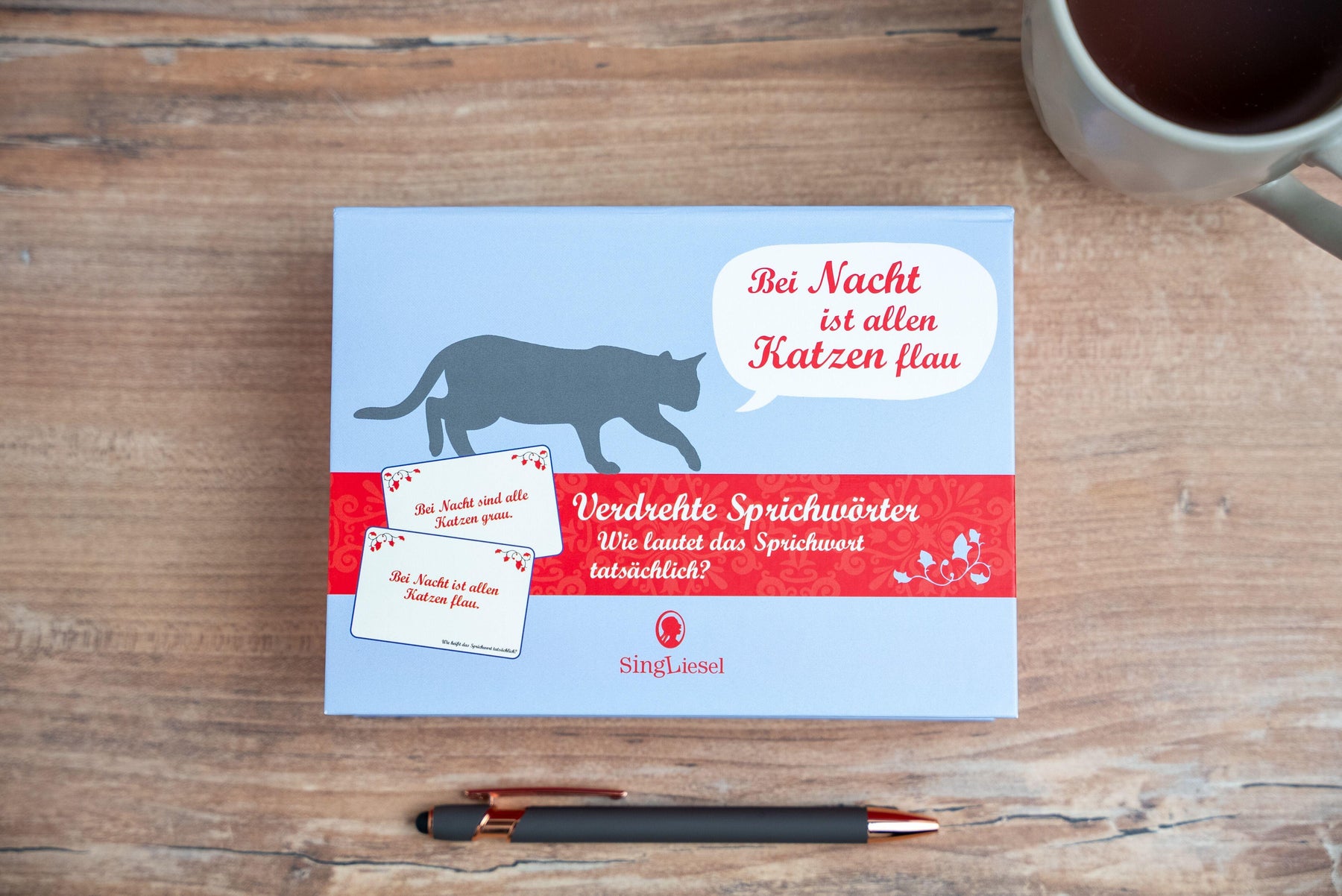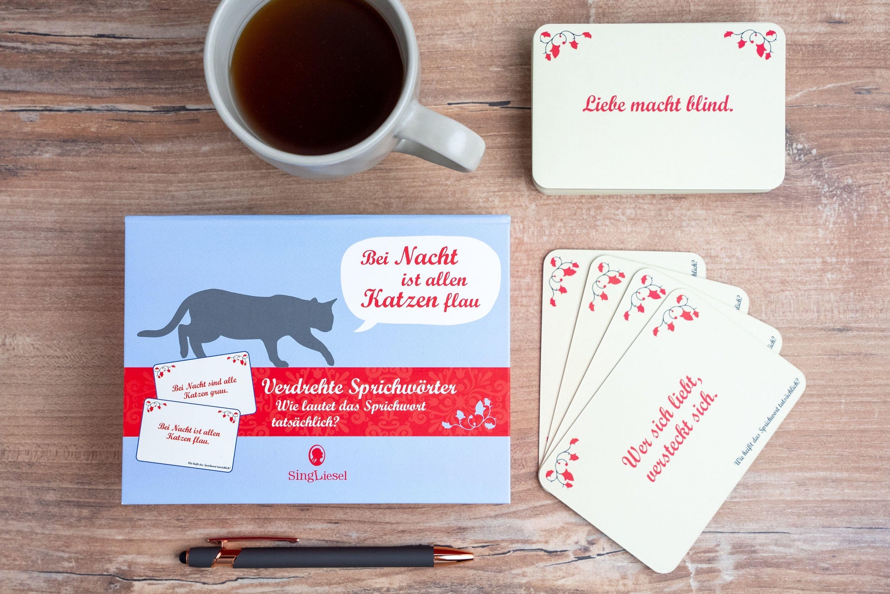 Auf jeder Ratekarte ist auf der Vorderseite ein verdrehtes Sprichwort zu sehen. Das korrekte Sprichwort kann erraten und auf der Rückseite nachgelesen werden.