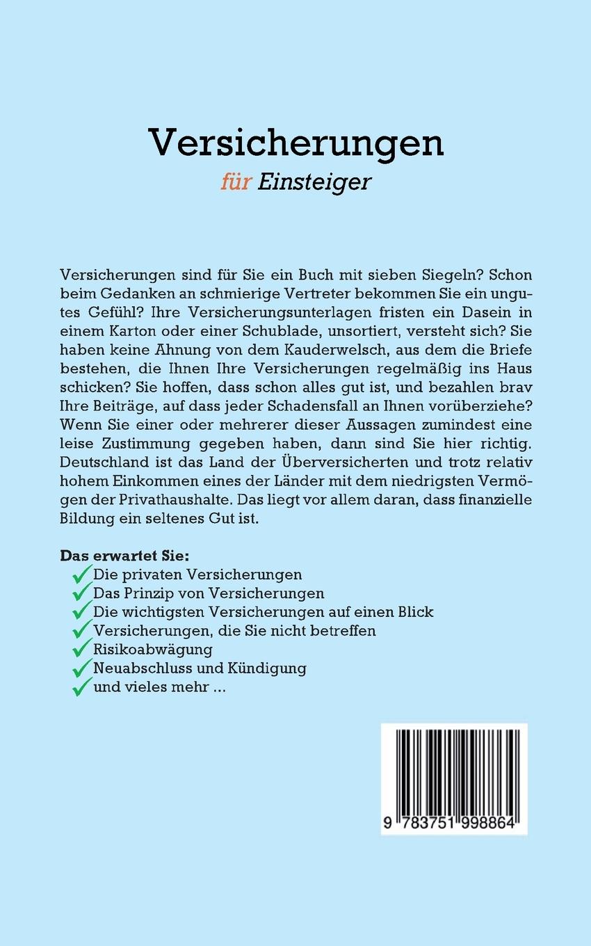 Versicherungen sind für Sie ein Buch mit sieben Siegeln? Schon beim Gedanken an schmierige Vertreter bekommen Sie ein ungutes Gefühl? Ihre Versicherungsunterlagen fristen ein Dasein in einem Karton oder einer Schublade, unsortiert, versteht sich? Sie haben keine Ahnung von dem Kauderwelsch, aus dem die Briefe bestehen, die Ihnen Ihre Versicherungen regelmäßig ins Haus schicken? Sie hoffen, dass schon alles gut ist, und bezahlen brav Ihre Beiträge, auf dass jeder Schadensfall an Ihnen vorüberziehe? Wenn Sie einer oder mehrerer dieser Aussagen zumindest eine leise Zustimmung gegeben haben, dann sind Sie hier richtig. Deutschland ist das Land der Überversicherten und trotz relativ hohem Einkommen eines der Länder mit dem niedrigsten Vermögen der Privathaushalte. Das liegt vor allem daran, dass finanzielle Bildung ein seltenes Gut ist. Das erwartet Sie: -Die privaten Versicherungen -Das Prinzip von Versicherungen -Die wichtigsten Versicherungen auf einen Blick -Versicherungen, die Sie nicht betreffen -Risikoabwägung -Neuabschluss und Kündigung -und vieles mehr ...
