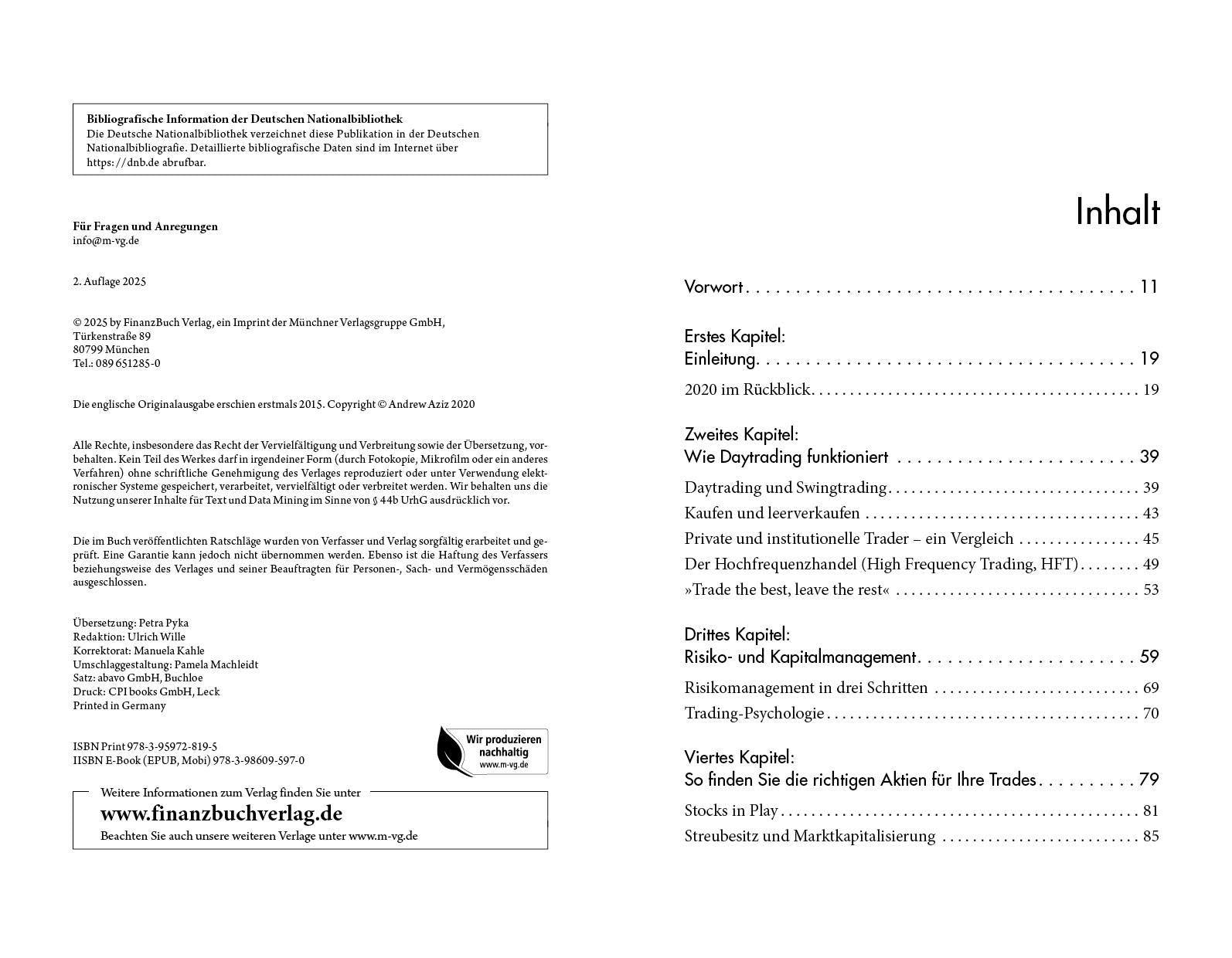 Aller Anfang ist schwer - das gilt insbesondere für den professionellen Aktienhandel. Der erfahrene Profi-Trader Andrew Aziz nimmt seine Leser an die Hand und erklärt leicht verständlich und mit dem nötigen Fachwissen, was ein professioneller Daytrader für sein tägliches Geschäft benötigt und wie sich regelmäßige Gewinne erzielen lassen, um langfristig gut vom Traden zu leben. Aziz erklärt, welche Werkzeuge und Software benötigt werden, wie man den richtigen Broker findet und wie der typische Tagesablauf eines Traders aussieht. Der Leser lernt den Unterschied zwischen Day- und Swingtrading und zwischen selbstständigen und institutionellen Tradern kennen und wird in die wichtigen Grundlagen des Risikomanagements und der Tradingpsychologie eingeführt. Für Einsteiger und Fortgeschrittene gleichermaßen wertvoll ist ein umfassender Überblick über neun klassische Handelsstrategien, die mit nachweislichem Erfolg von zahlreichen Profis eingesetzt werden, und Tipps zum Erarbeiten der eigenen, ganz persönlichen Strategie. Ein modernes Standardwerk des Daytradings, das jeder, der in Zukunft seinen Lebensunterhalt mit Daytrading bestreiten möchte, unbedingt lesen sollte.