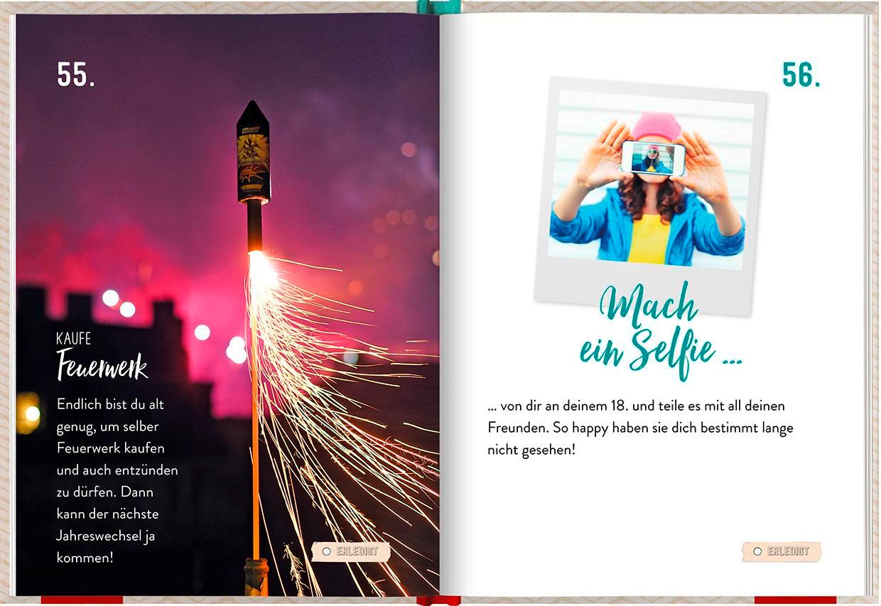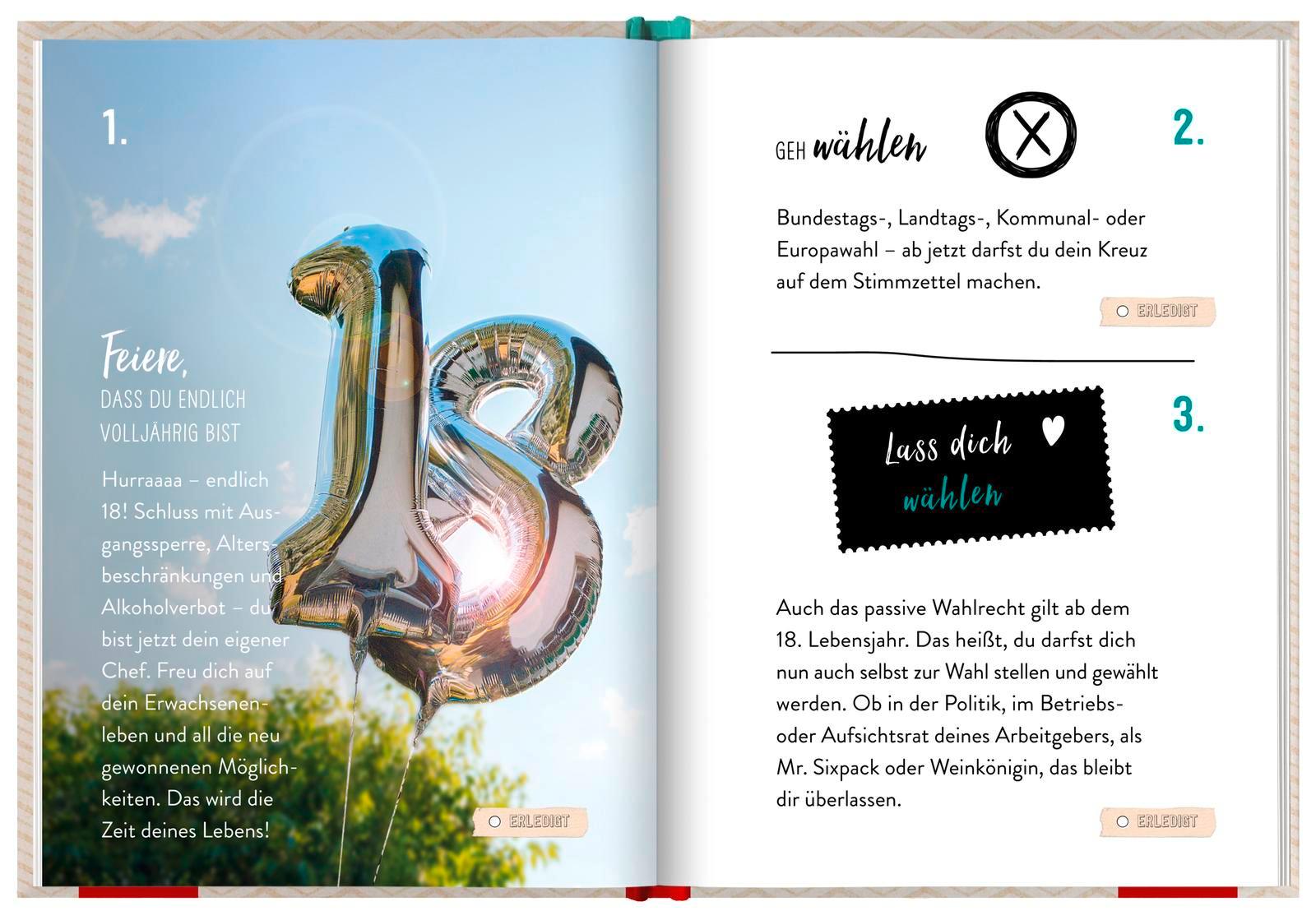 Das 100 Dinge Buch inspiriert mit viel Humor dazu, die Volljährigkeit und das Leben zu genießen. Neue Dinge ausprobieren. Die Welt entdecken. Mit einem Augenzwinkern werden auch Ideen beschrieben, die ab sofort keinem Einverständnis der Eltern mehr bedürfen. Jede erfüllte Aufgabe und jedes Erlebnis kann auf der entsprechenden Seite abgehakt werden.