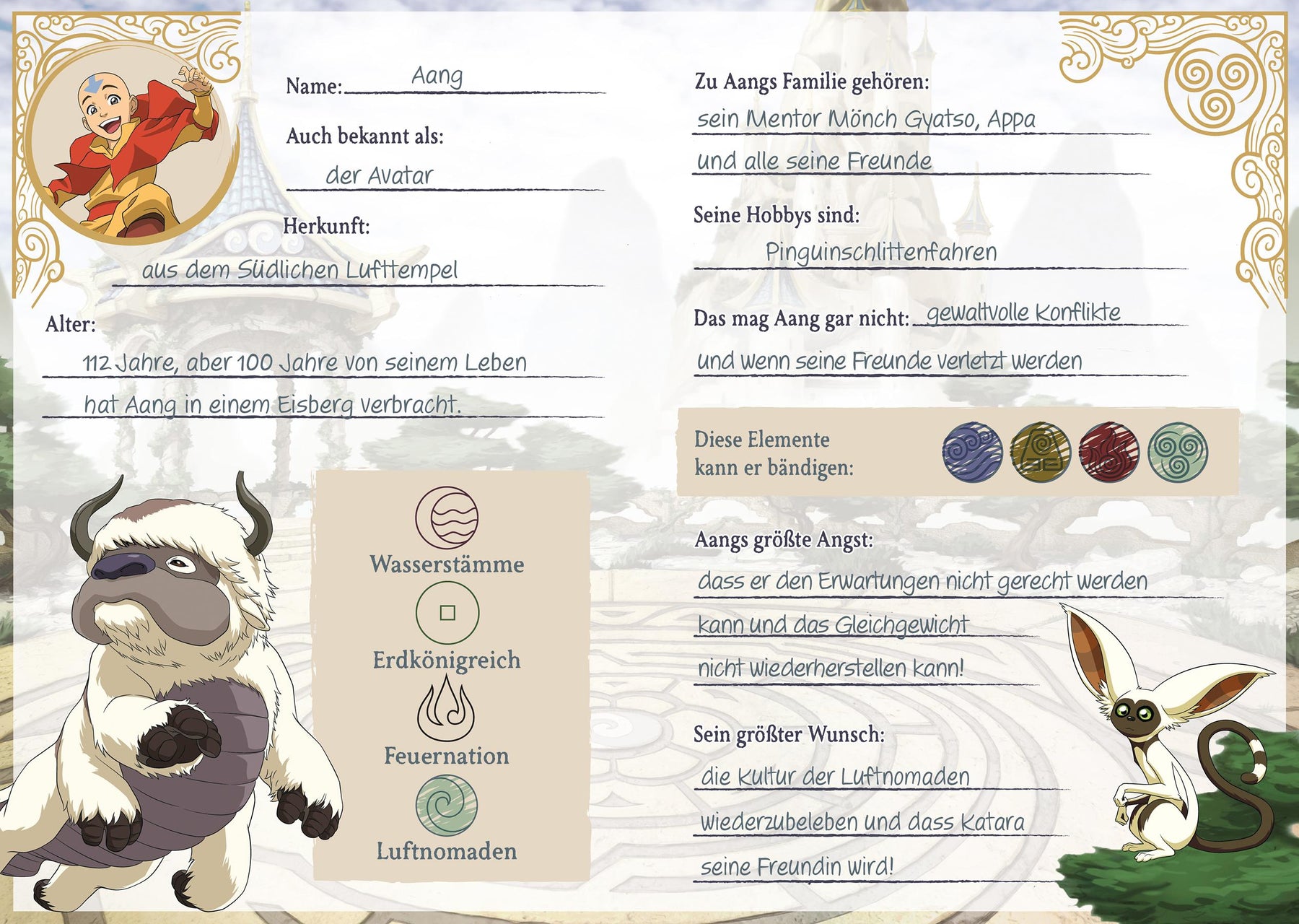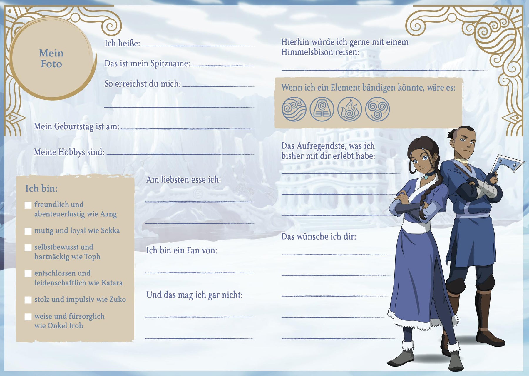 Willkommen in der Welt von Avatar Aang und seinen Freunden! Dieses Freundebuch ist genau das Richtige für Avatar-Fans. Alle deine Freunde können sich eintragen und dir einiges über sich verraten. Findet zusammen heraus, welcher Bändiger in euch steckt, und klebt auf der Fotoseite eure schönsten gemeinsamen Bilder ein!
