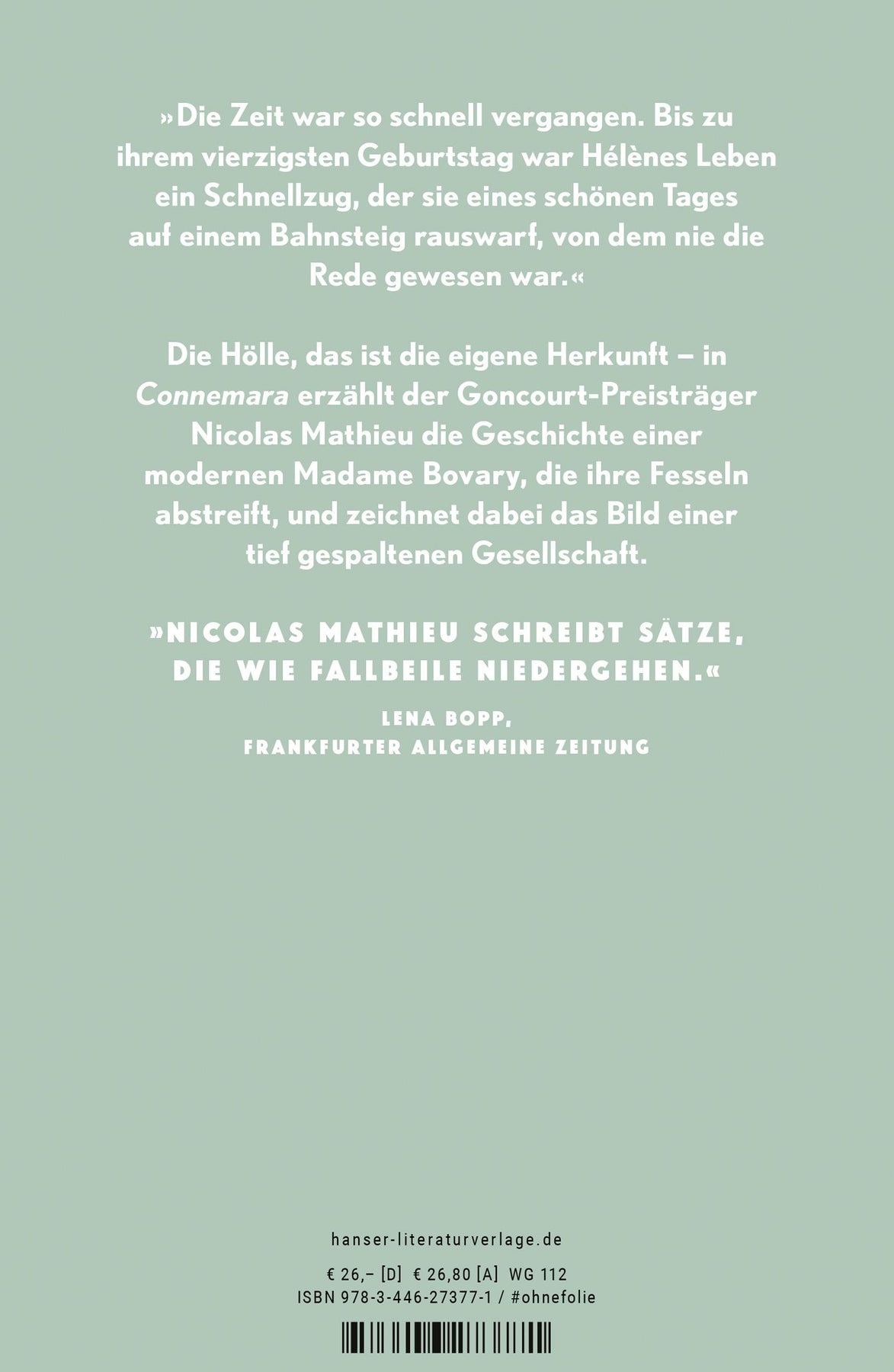 Nach dem Bestseller "Rose Royal" schreibt Goncourt-Preisträger Nicolas Mathieu über eine moderne Madame Bovary, die ihre Fesseln abstreift. Hélène ist fast vierzig Jahre alt. Sie hat Karriere gemacht, geheiratet, zwei Töchter bekommen und lebt in einem Architektenhaus in der Nähe von Nancy. Sie hat sich den Traum ihrer Jugend erfüllt: abhauen, das Milieu wechseln, erfolgreich sein. Christophe hingegen hat die kleine Stadt im Osten Frankreichs, in dem er und Hélène aufgewachsen sind, nie verlassen. Er verkauft Hundefutter und führt ein unentschlossenes kleines Leben. Bis er Hélène wiedertrifft. "Connemara" ist eine Geschichte über das tiefe Unbehagen der Klassenaufsteiger und über unsere moderne Arbeitswelt zwischen PowerPoint und Open Space. Es ist auch eine Geschichte über das Zittern in der Mitte des Lebens, und über die Sehnsucht, noch mal von vorne zu beginnen. Nur dass bei Nicolas Mathieu das Politische immer im Privaten verborgen liegt.