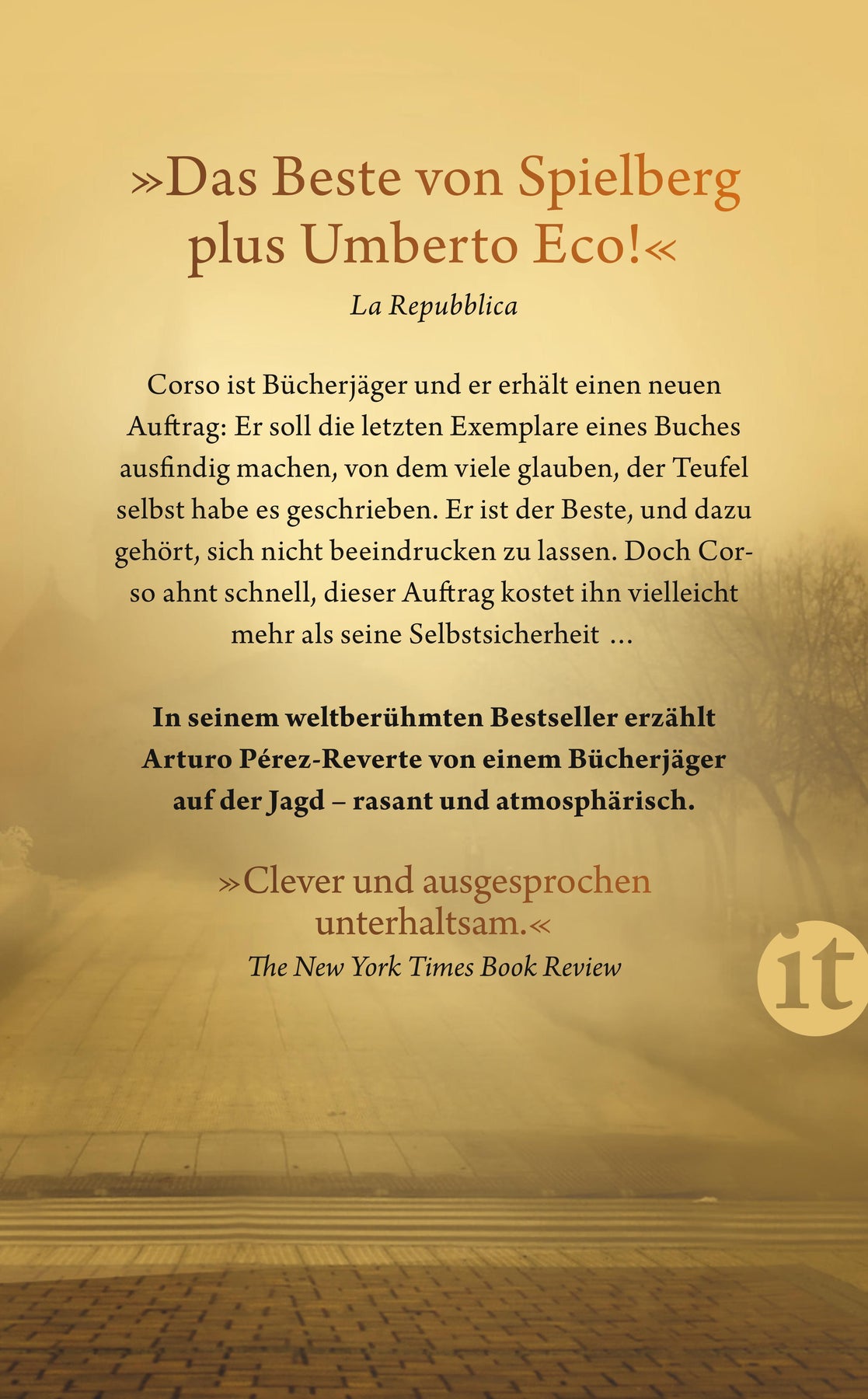 Corso ist Bücherjäger und er erhält zwei neue Aufträge: ein Originalmanuskript von Alexandre Dumas überprüfen und die letzten Exemplare eines Buches ausfindig machen, von dem viele glauben, der Teufel selbst habe es geschrieben. Er ist der Beste, und dazu gehört, sich nicht beeindrucken zu lassen. Doch kurze Zeit später wird Corso beinahe von einem Gerüst erschlagen, dann fast von einem Auto erfasst, und an der Straßenecke steht dieser Mann mit der Narbe im Gesicht, als sei er einem Abenteuerroman entstiegen. Corso ahnt, diese Aufträge kosten ihn vielleicht mehr als seine Selbstsicherheit ... Das Zeugnis einer gefährlichen Leidenschaft. Der Weltbestseller über den Wahnsinn, den es bedeutet, zu lesen. Das Abenteuer rund um ein teuflisches Geheimnis. In seinem berühmten Klassiker 'Der Club Dumas' erzählt Arturo Pérez-Reverte von einem Bücherjäger auf der Jagd - rasant und atmosphärisch.