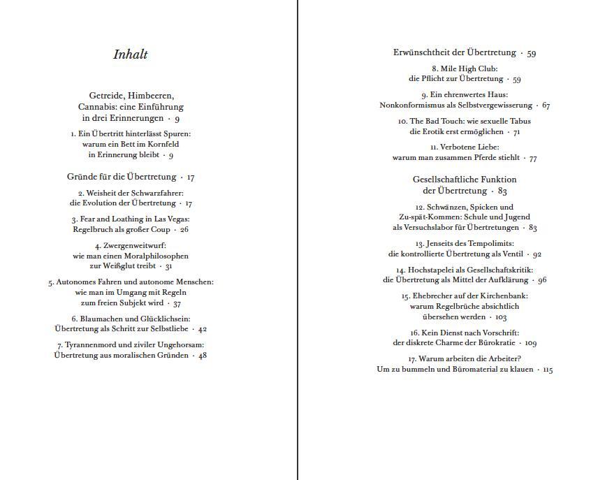 Was macht die Überschreitung des Erlaubten so reizvoll, warum fasziniert das Spiel mit dem Verbotenen? Spicken, Schwarzfahren, Rasen, illegale Substanzen oder ein kleiner Diebstahl ..., erinnern wir uns nicht alle mit leisem Behagen an den einen oder anderen schadlos überstandenen Regelverstoß? Es scheint, als ob wir solche Momente immer wieder suchen, sie unser Leben auf spezielle Weise bereichern. Dient diese gelegentliche Abweichung vom Regelkonformen vielleicht dazu, unsere Autonomie zu behaupten? Ist sie am Ende bedeutender Teil des Menschseins? Hält der Regelbruch mitunter das geregelte Leben am Laufen und hat womöglich sogar das Potenzial, gesellschaftliche Entwicklungen voranzutreiben? Wie viel es jenseits des Erlaubten zu entdecken gibt, zeigt uns Leander Steinkopf in seinem unterhaltsamen und pointierten Essay.