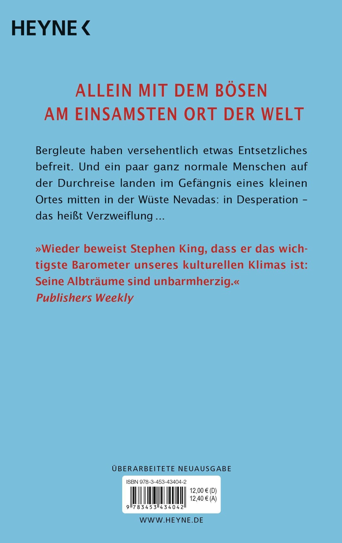 Im Bergbaustädtchen Desperation ist das Gewebe zwischen den Welten dünn. Bergleute sind versehentlich in eine andere Dimension durchgebrochen und haben einen schrecklichen Dämon freigesetzt. Ein paar Urlauber auf der Durchreise landen im Gefängnis des kleinen Ortes mitten in der Wüste Nevadas: Desperation - das heißt Verzweiflung ...