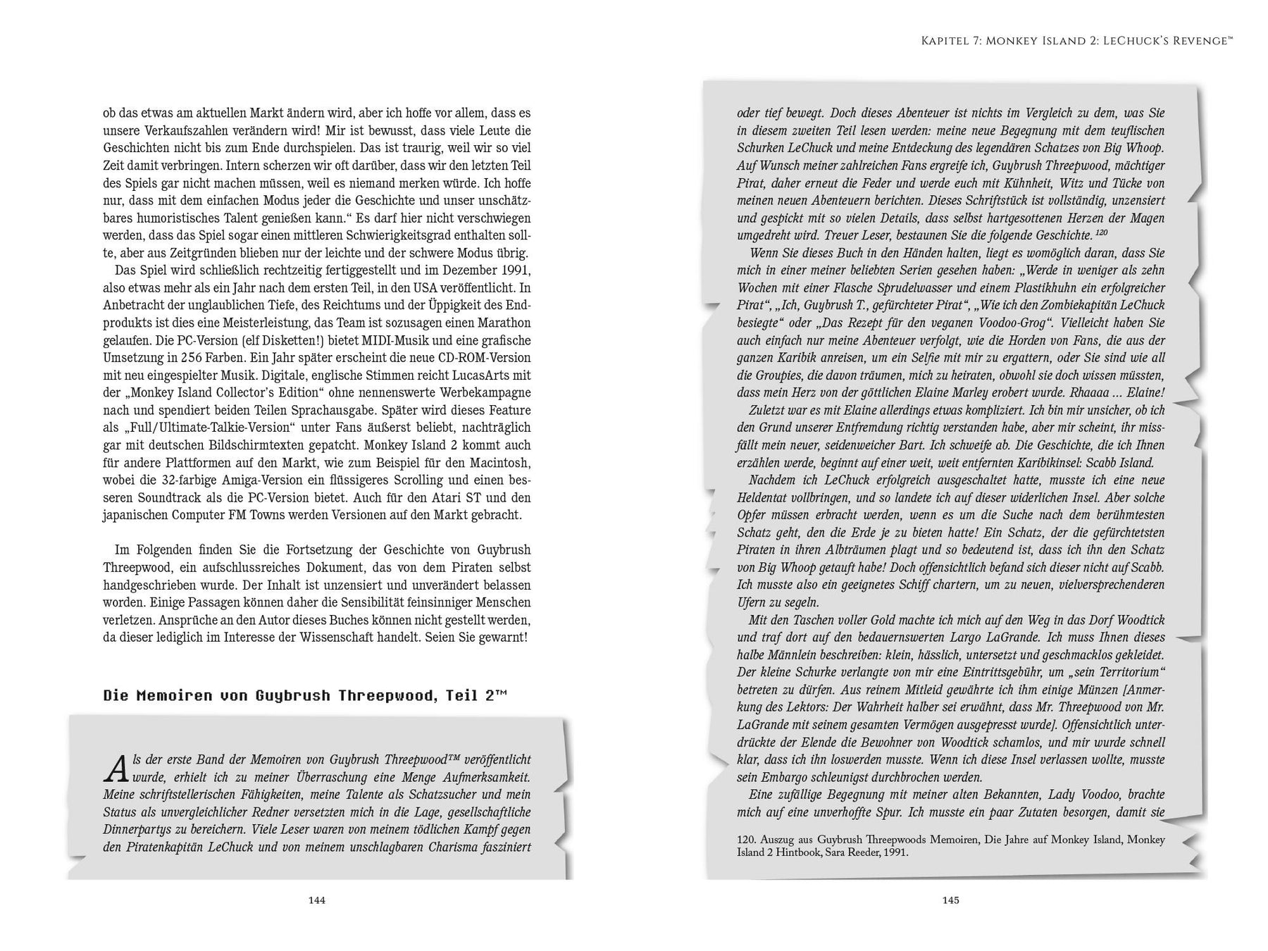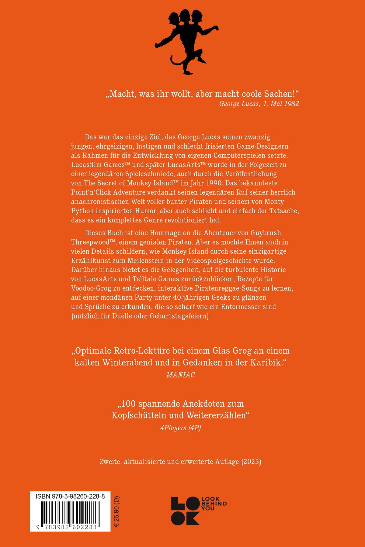"Macht, was ihr wollt, aber macht coole Sachen!" - George Lucas am 1. Mai 1982. Das war das einzige Ziel, das George Lucas seinen zwanzig jungen, ehrgeizigen, lustigen und schlecht frisierten Game-Designern als Rahmen für die Entwicklung von eigenen Computerspielen setzte. Lucasfilm Games und später LucasArts wurde in der Folgezeit zu einer legendären Spieleschmiede, auch durch die Veröffentlichung von The Secret of Monkey Island(TM) im Jahr 1990. Das bekannteste Point'n'Click-Adventure verdankt seinen legendären Ruf seiner herrlich anachronistischen Welt voller bunter Piraten und seinem von Monty Python inspirierten Humor, aber auch schlicht und einfach der Tatsache, dass es ein komplettes Genre revolutioniert hat. Dieses Buch ist eine Hommage an die Abenteuer von Guybrush Threepwood, einem genialen Piraten. Aber es möchte Ihnen auch in vielen Details schildern, wie Monkey Island durch seine einzigartige Erzählkunst zum Meilenstein in der Videospielgeschichte wurde.