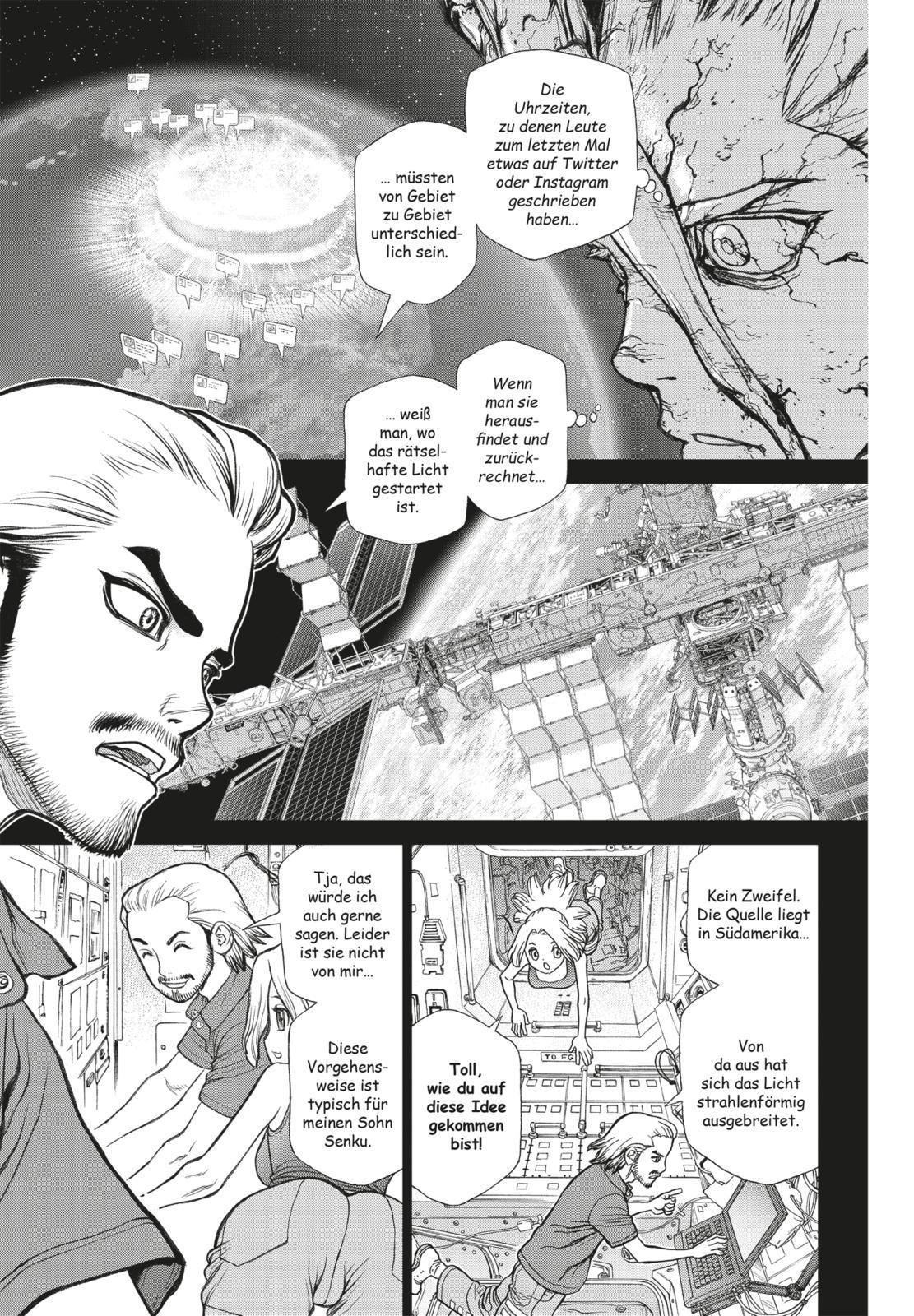 Nachdem die Menschheit zu Stein erstarrt war, kehrte Senkus Vater, Byakuya, auf die Erde zurück. Und er hinterließ seinem Sohn etwas, das ihn abertausend Jahre später erreicht... In der Gegenwart werden Senku und seine Freunde von Attentätern aus dem Tsukasa-Imperium überfallen. Inmitten dieser Notlage macht sich Senku daran, die stärkste aller Waffen, »das Schwert der Wissenschaft« zu entwickeln, um das Dorf zu retten!
