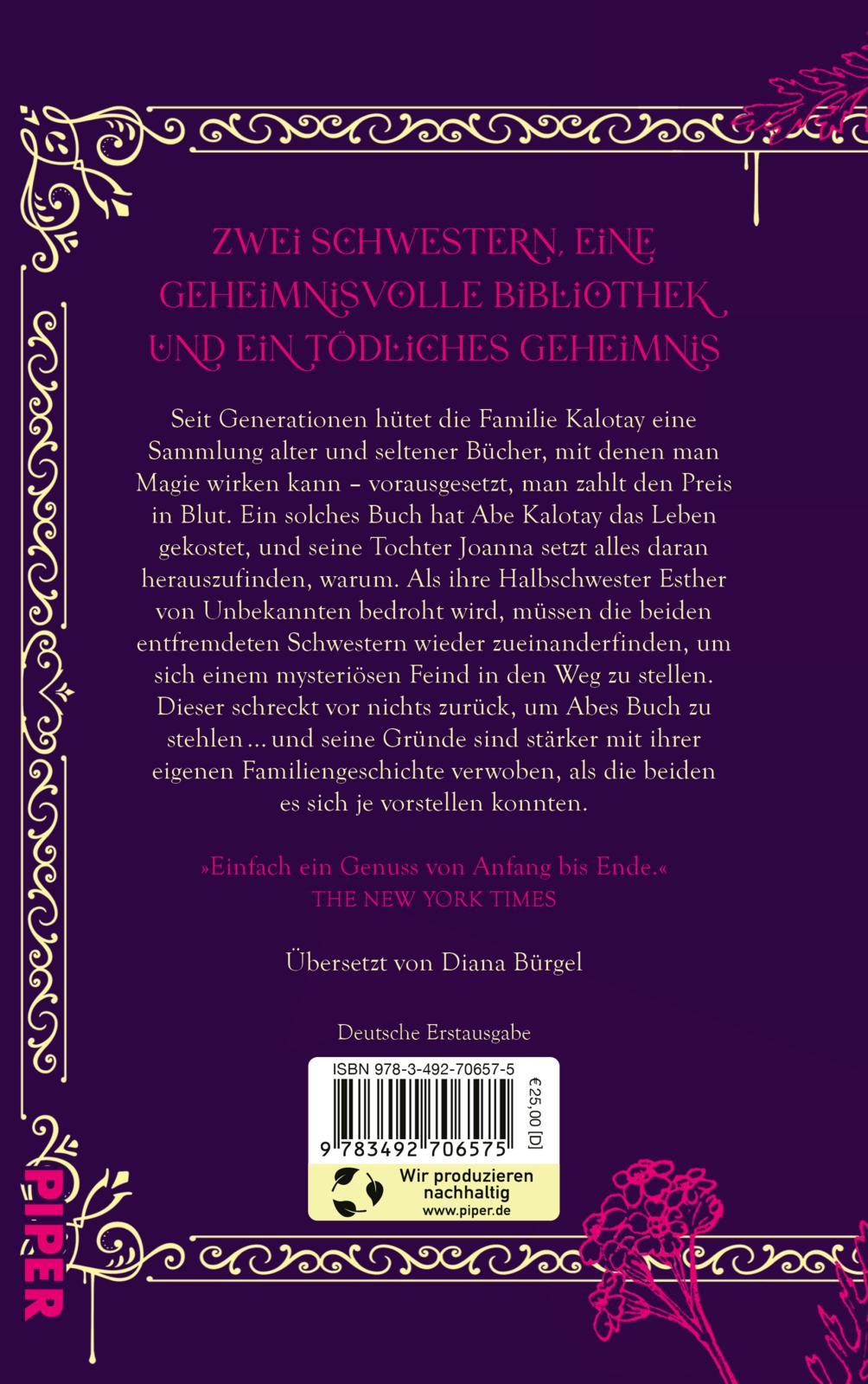 Seit Generationen hütet die Familie Kalotay eine Sammlung alter und seltener Bücher. Bücher, mit denen man Magie wirken kann - vorausgesetzt, man zahlt den Preis in Blut. Ein solches Buch hat Abe Kalotay das Leben gekostet, und seine Tochter Joanna setzt alles daran, herauszufinden, warum. Als ihre Halbschwester Esther von Unbekannten bedroht wird, müssen die beiden entfremdeten Schwestern wieder zueinander finden, um sich einem mysteriösen Feind in den Weg zu stellen. Doch dieser schreckt vor nichts zurück, um Abes Buch zu stehlen - nicht einmal vor Mord.