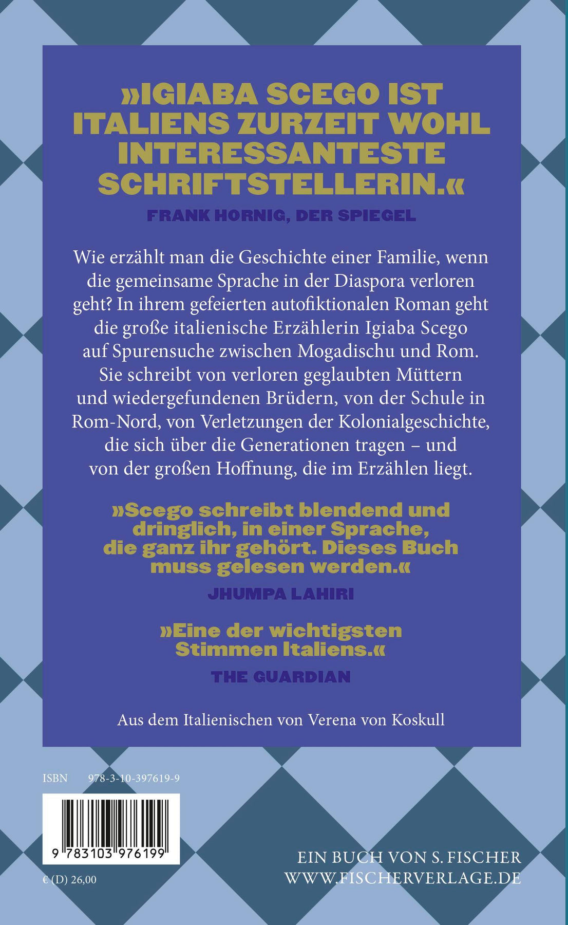 Wie erzählt man die Geschichte einer Familie, wenn die gemeinsame Sprache in der Diaspora verloren geht? Wenn die Erinnerungen trügen und geliebte Verwandte seit Generationen in die ganze Welt zerstreut leben? In ihrem gefeierten autofiktionalen Roman geht die große italienische Erzählerin Igiaba Scego auf Spurensuche zwischen Mogadischu und Rom. Sie erzählt von verloren geglaubten Müttern und wiedergefundenen Brüdern, von einer Kindheit als Hirtin und der Schule in Rom-Nord, von Verletzungen der Kolonialgeschichte, die sich über die Generationen tragen - und von der großen Hoffnung, die im Erzählen liegt.
