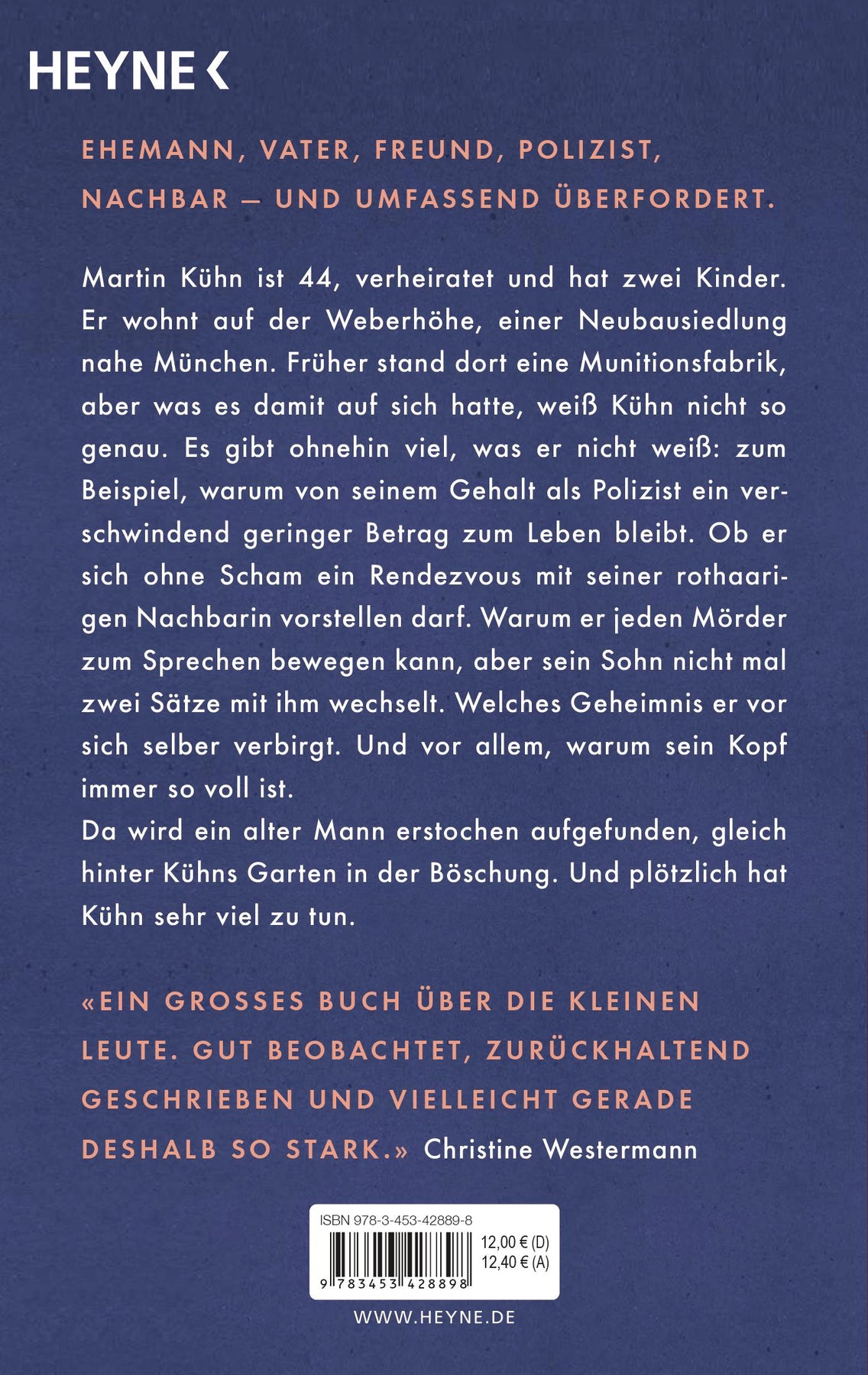 Martin Kühn ist 44, verheiratet und hat zwei Kinder. Er wohnt auf der Weberhöhe, einer Neubausiedlung nahe München. Früher stand dort eine Munitionsfabrik, aber was es damit auf sich hatte, weiß Kühn nicht so genau. Es gibt ohnehin viel, was er nicht weiß: Zum Beispiel, warum von seinem Gehalt als Polizist ein verschwindend geringer Betrag zum Leben bleibt. Ob er sich ohne Scham ein Rendezvous mit seiner rothaarigen Nachbarin vorstellen darf. Warum er jeden Mörder zum Sprechen bewegen kann, aber sein Sohn nicht mal zwei Sätze mit ihm wechselt. Welches Geheimnis er vor sich selber verbirgt. Und vor allem, warum sein Kopf immer so voll ist.
