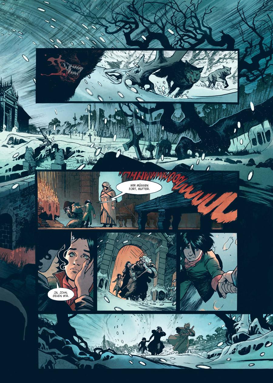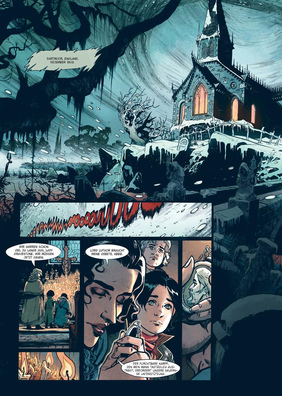 Schon früh in seinem Leben legte Lord John Gravestone, einziger Sohn des gefallenen Vampirjägers Luthor Gravestone, den Eid ab, das Werk seines Vaters fortzuführen. Die gestrenge Ausbildung seines Onkels hinderte ihn bisher daran, diesem Versprechen nachzukommen, dabei ist John begierig darauf, sich den Kreaturen der Nacht zu stellen, die sein Vater bekämpfte und die ihn letztlich das Leben kosteten. Als beunruhigende Berichte aus Rom die englische Heimat erreichen, sieht John seine Stunde endlich gekommen: Camilla von Holbein, eine mächtige Striga und geschworene Feindin der Familie Gravestone, ist wieder zu unheiligem Leben erwacht¿ Angesiedelt knapp 100 Jahre vor »Dracula«, sind in Jérome Le Gris und Nicolas Siners gotisch-düsterem Vampir-Mythos »Lord Gravestone« viktorianische Ästhetik und effektvolle Comic-Kunst zu einem faszinierenden Ganzen vereint. Dabei zitieren die Künstler lustvoll sowohl aus literarischen Vorlagen, die schon Bram Stoker inspirierten, als auch aus moderner Phantastik wie »The Witcher«.