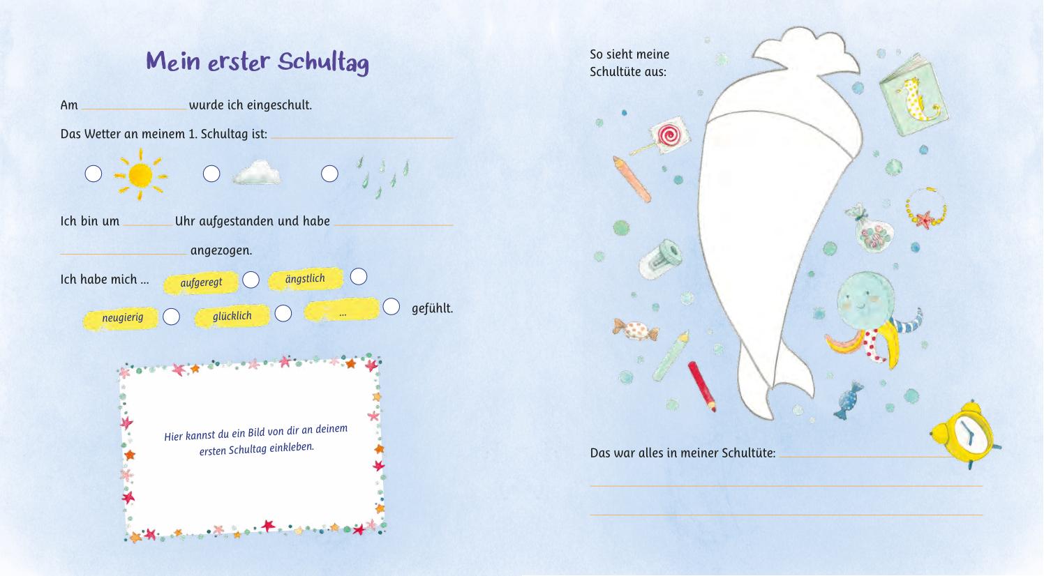 Endlich ist es so weit, der ersehnte Tag ist gekommen: die Einschulung! In diesem Album kannst du die schönsten Momente dieses besonderen Tages und des ganzen ersten Schuljahrs festhalten. Trage ein, was alles in deiner Schultüte steckt, wie du mit deiner Familie die Einschulung gefeiert hast und welche Fächer dir im ersten Jahr am meisten Spaß gemacht haben, was in deinem Schulranzen ist und deinen Stundenplan. Zusätzlich ist noch jede Menge Platz für Fotos und Bilder, zum Beispiel für das erste Klassenfoto.