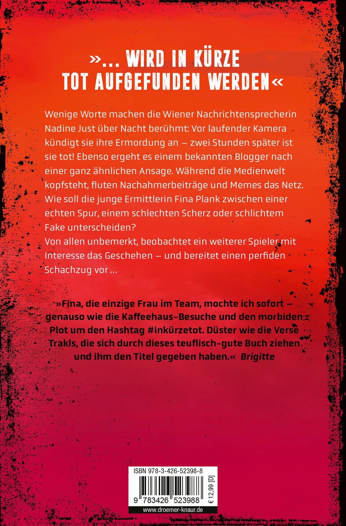 Wenige Worte machen die aufstrebende Wiener Nachrichtensprecherin Nadine Just über Nacht berühmt: Vor laufender Kamera kündigt sie ihre Ermordung an - zwei Stunden später ist sie tot! Ebenso ergeht es dem Blogger Gunther Marzik nach einer ganz ähnlich lautenden Ankündigung. Während die österreichische Medienwelt kopfsteht, trendet der Hashtag #inkürzetot, Nachahmer-Beiträge und Memes fluten das Netz. Wie soll die junge Ermittlerin Fina Plank im fünfköpfigen Team der Wiener 'Mordgruppe' zwischen einer echten Spur, einem schlechten Scherz oder schlichtem Fake unterscheiden? Schließlich rückt Nadines Ex-Freund Tibor Glaser ins Zentrum von Finas Ermittlungen, ein aalglatter Werbefachmann und Weiberheld, der verzweifelt seine Unschuld beteuert.